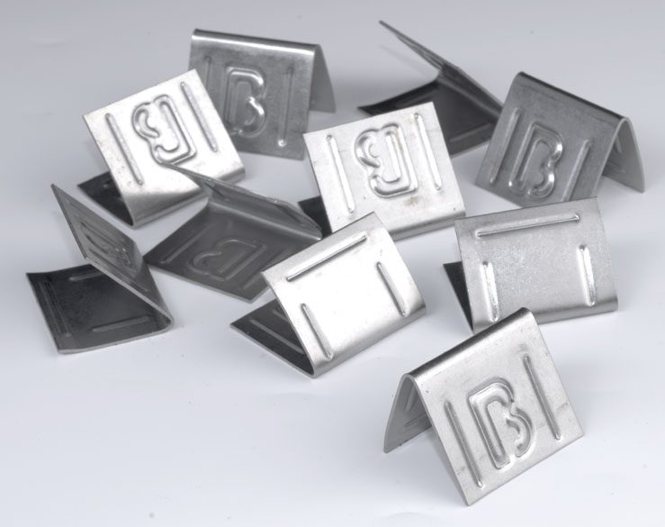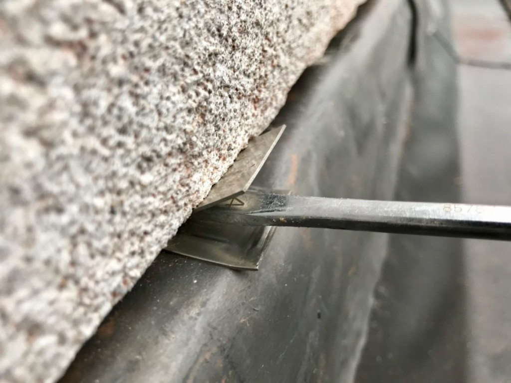 Als de strook lood eenmaal in de muur zit, dan sla je er een loodklem in. Een heel sterk verend stukje dubbelgevouwen roestvrij staal.