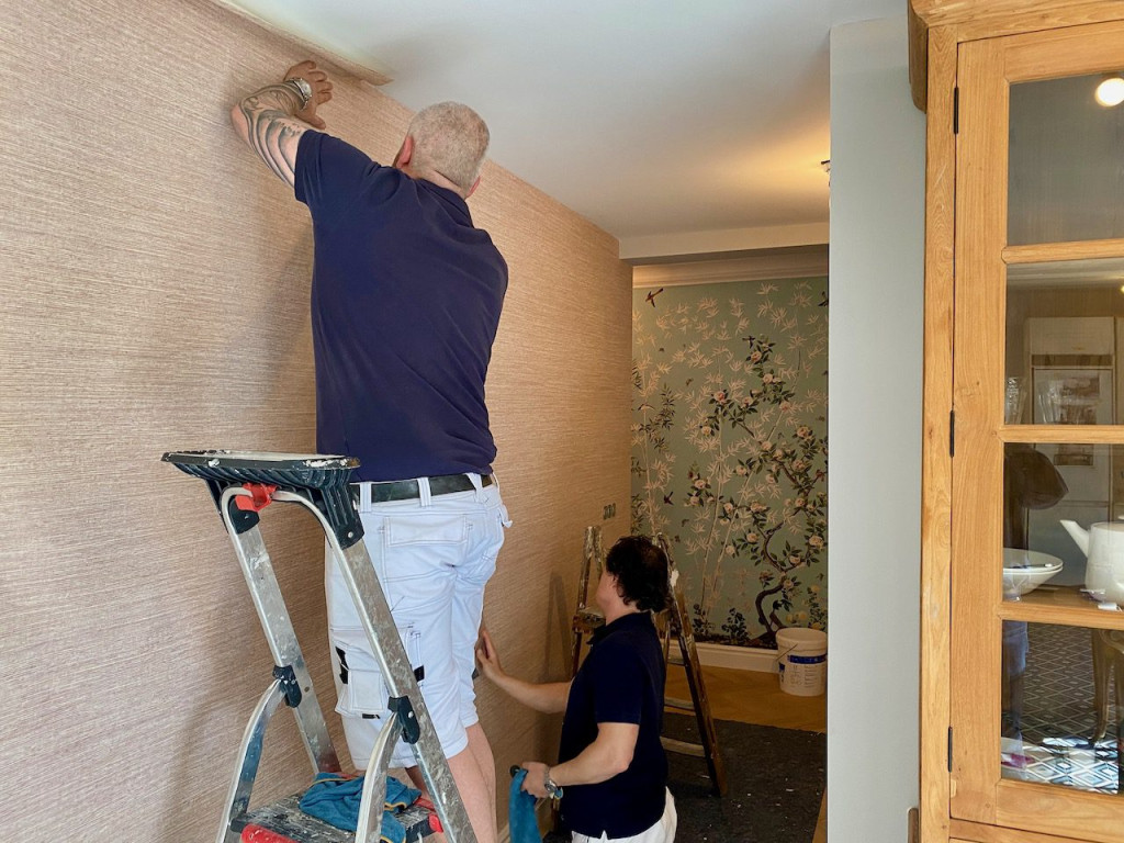 Rond 14:00 was het eind in zicht. De mannen bundelden alle krachten. Drie behangers en een fotograaf zal ook wel niet mogen, Coronatechnisch, maar het leverde een leuke foto op.