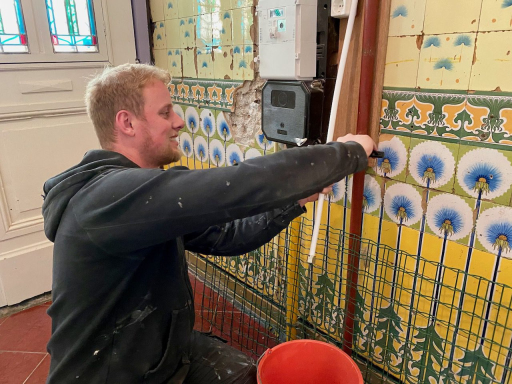 Er was ook activiteit in het trappenhuis. Ik dacht dat alleen de Polen stuntlieden waren, maar de mannen van Chris bleken ook al maling te hebben aan de Arbowet.