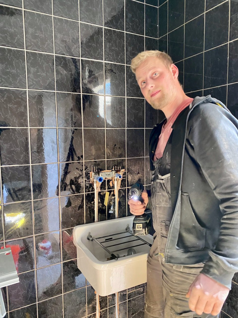 Helemaal verkeerd Bart, hij moet 15 centimeter lager. Geduldig verplaatste Bart de gootsteen. Ja, zo hangt hij goed. Ook bereidde hij de aansluiting voor een tweede buitenkraan voor.