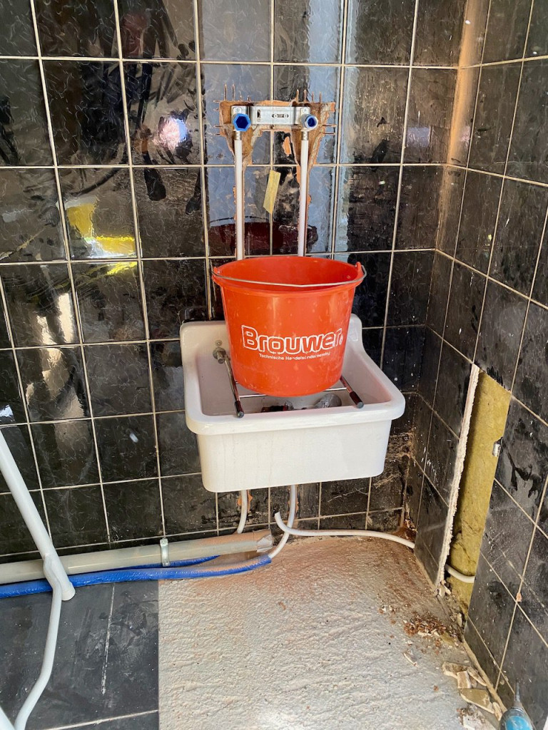 Een week of wat geleden hadden we op Marktplaats een leuke oude uitstortgootsteen gekocht, voor in onze wasmachinekamer. Bart hing hem voor ons op.