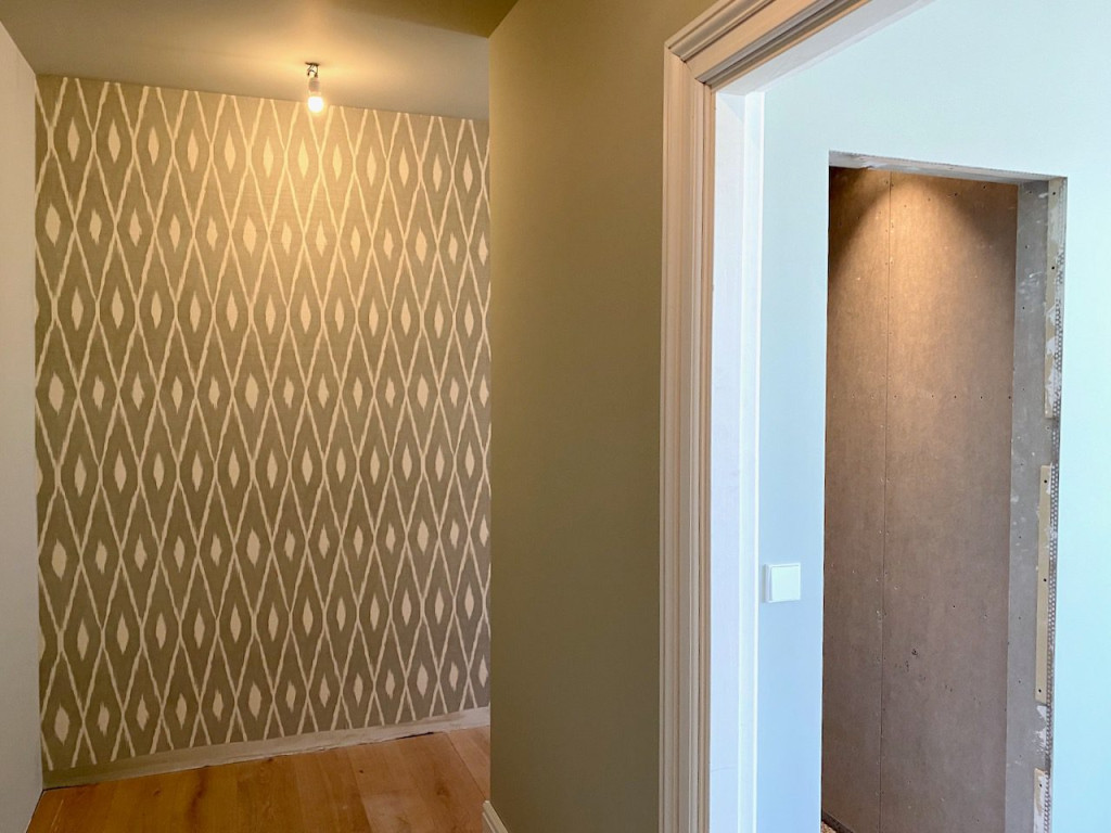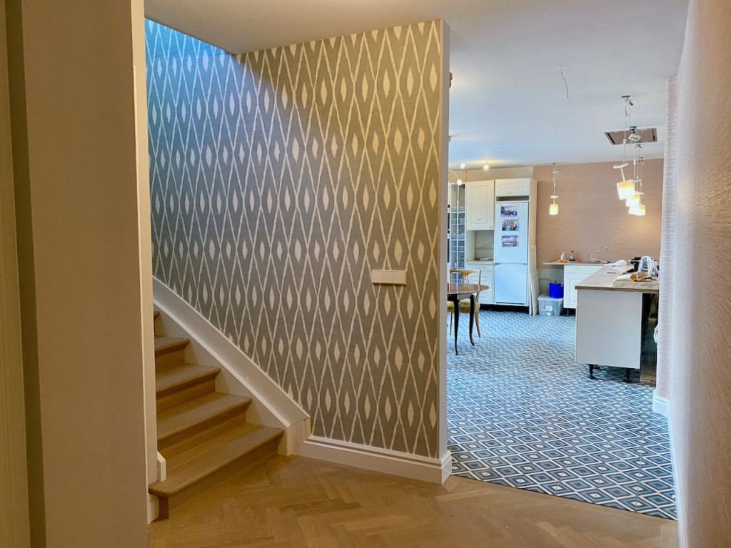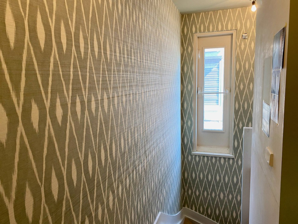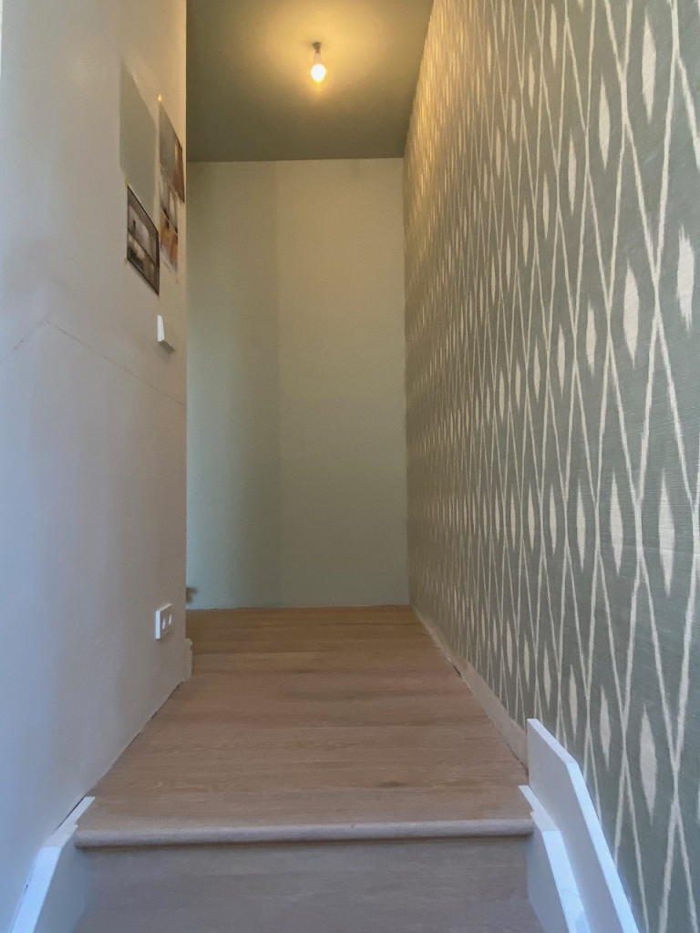 Het stuntteam in het trappenhuis werkte intussen onvermoeibaar voort. Onze buitenmuur is heel erg scheef, het kostte heel veel inspanning om het behang toch enigszins recht in de hoek te krijgen.
