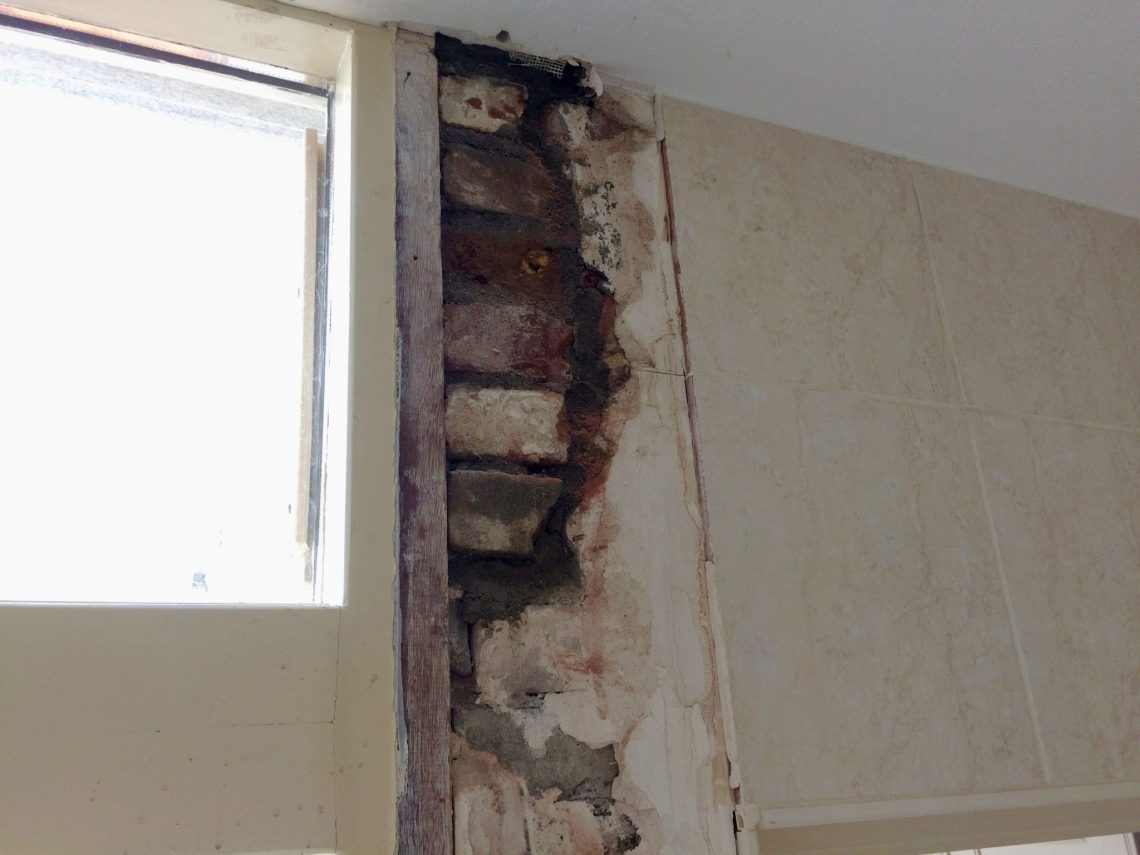 Ik had een paar dagen geleden de stalen balk boven de schuifpui blootgelegd. Hij bleek op een heel klein stukje steen te rusten, wat weer min of meer op een houten balkje wat recht omlaag de keuken inliep steunde.