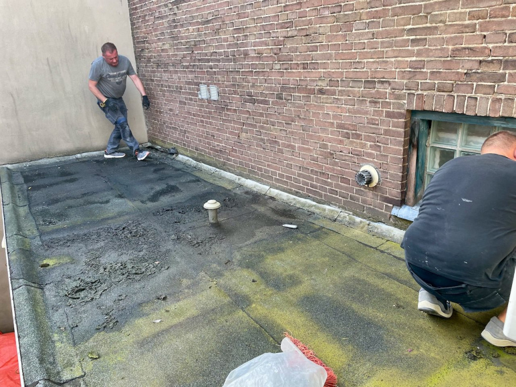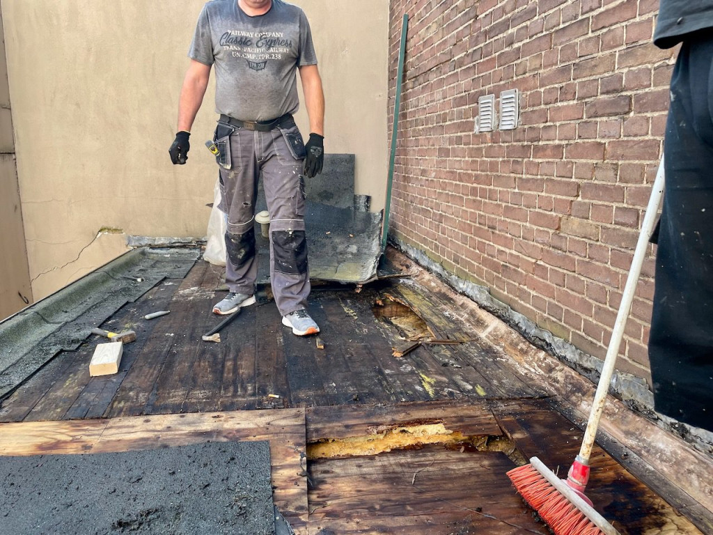 Het badkamerdak ligt er nu schoon en verlaten bij. Morgen gaan we de nieuwe balkenlaag monteren.