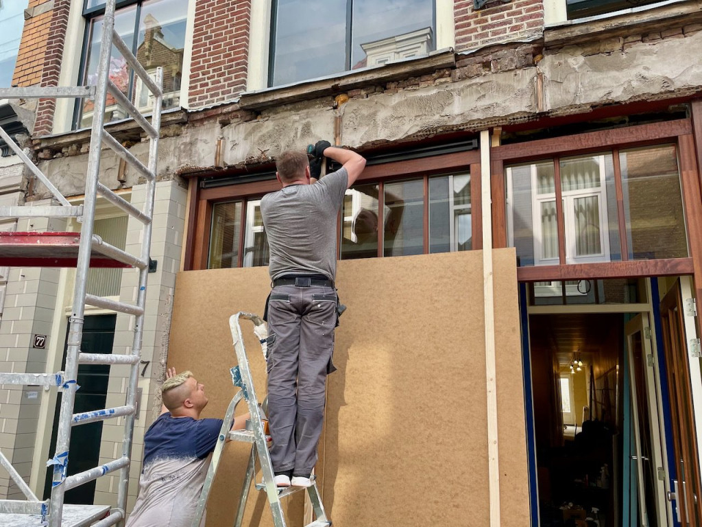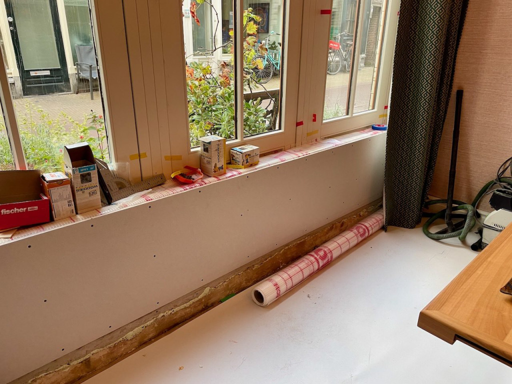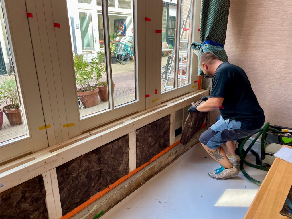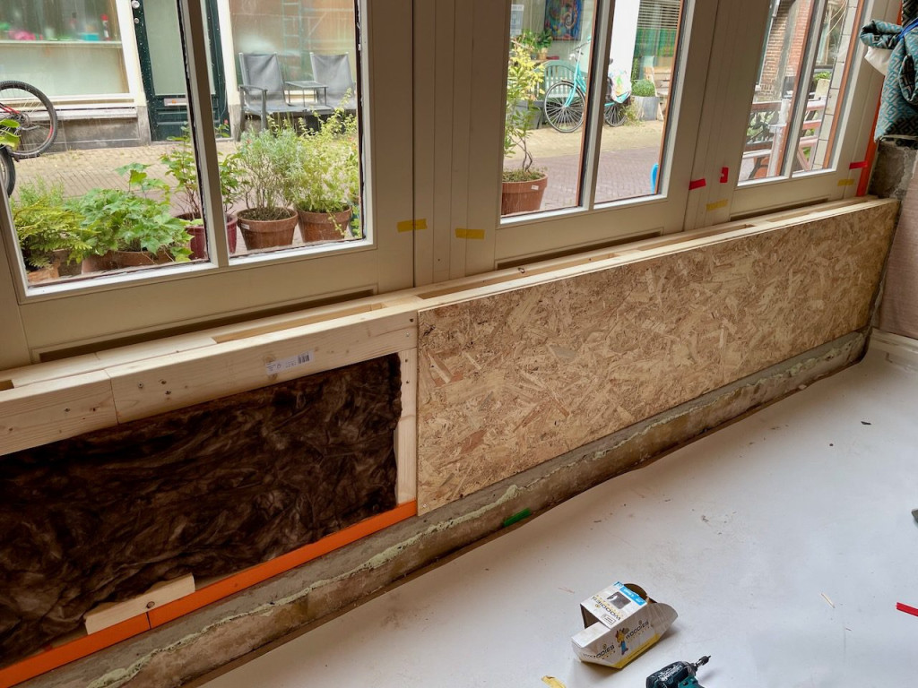 Tegen de voorkant werd OSB (een houtsoort gemaakt van aan elkaar gelijmd versnipperd resthout) geschroefd. Daaroverheen kwam een damp-open folie, en ten slotte een gipsplaat.