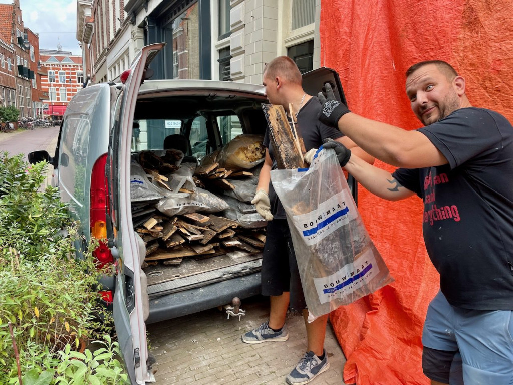 Victor en Darek hebben het hele dak gesloopt. Vier balken waren verrot, die gaan we vervangen. De rest van de balken blijven zitten.