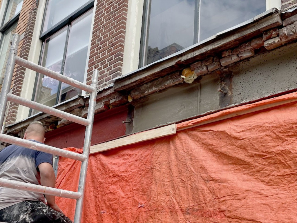 Ondertussen werd er bij de buren op nr 77, het Theater, buiten gewerkt. In 1900 zijn de beide onderetages samengevoegd. De bovenhuizen zijn op een metalen balkconstructie geplaatst. De H-balk waar de bovengevels op staan gaan we binnenkort gebruiken. Daar word onze nieuwe aluminium show-balk aan opgehangen. Maar daartoe moest hij eerst schoon en goed toegankelijk zijn. Dus werd er hout en mortel van ruim 120 jaar oud weggehaald.
