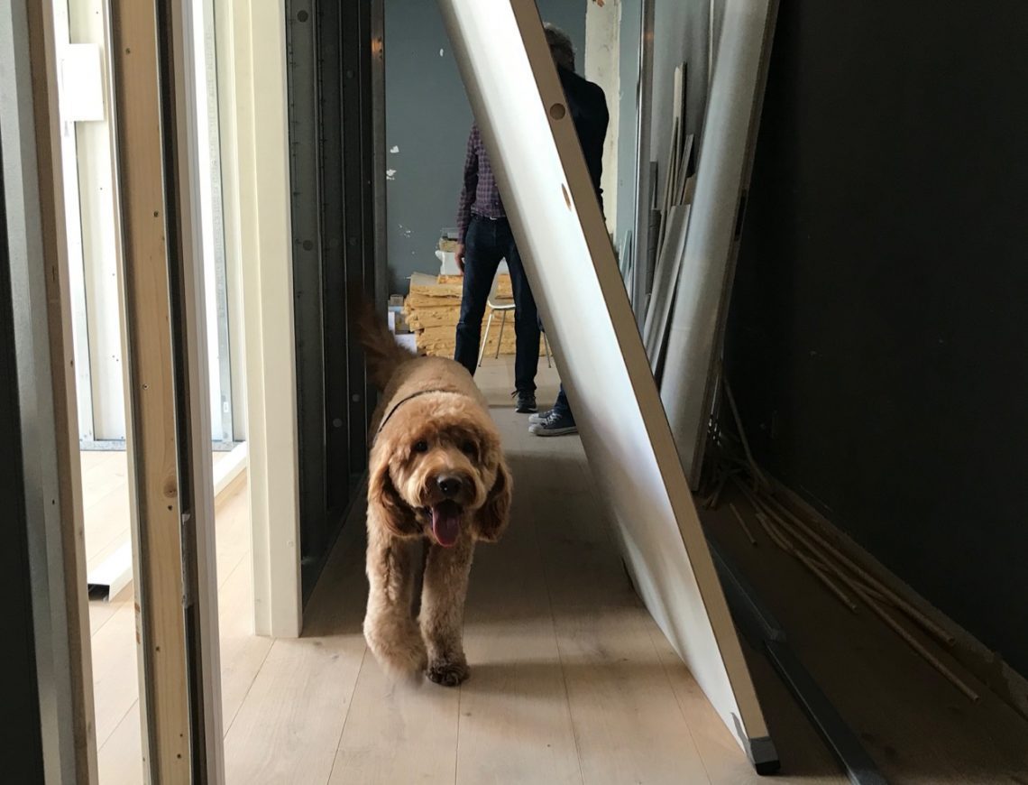 Het was een prachtige dag en Kees en Kartrin zouden even in Haarlem komen theedrinken en daarna gingen we een wandeling maken, zodat hun hond Bertus ook een beetje een leuke middag had. Gisteren zei Hessel al in een bijzinnetje tegen me ‘zou fijn zijn als Kees misschien even kon helpen met de deur naar boven te tillen’. De Deur is de schuifdeur van onze slaapkamer. Deze deur is vorige week met de grootste vrachtauto ever gebracht en de bezorger wilde ‘m nog net even binnen helpen zetten, maar de rest moest Hessel zelf uitzoeken..