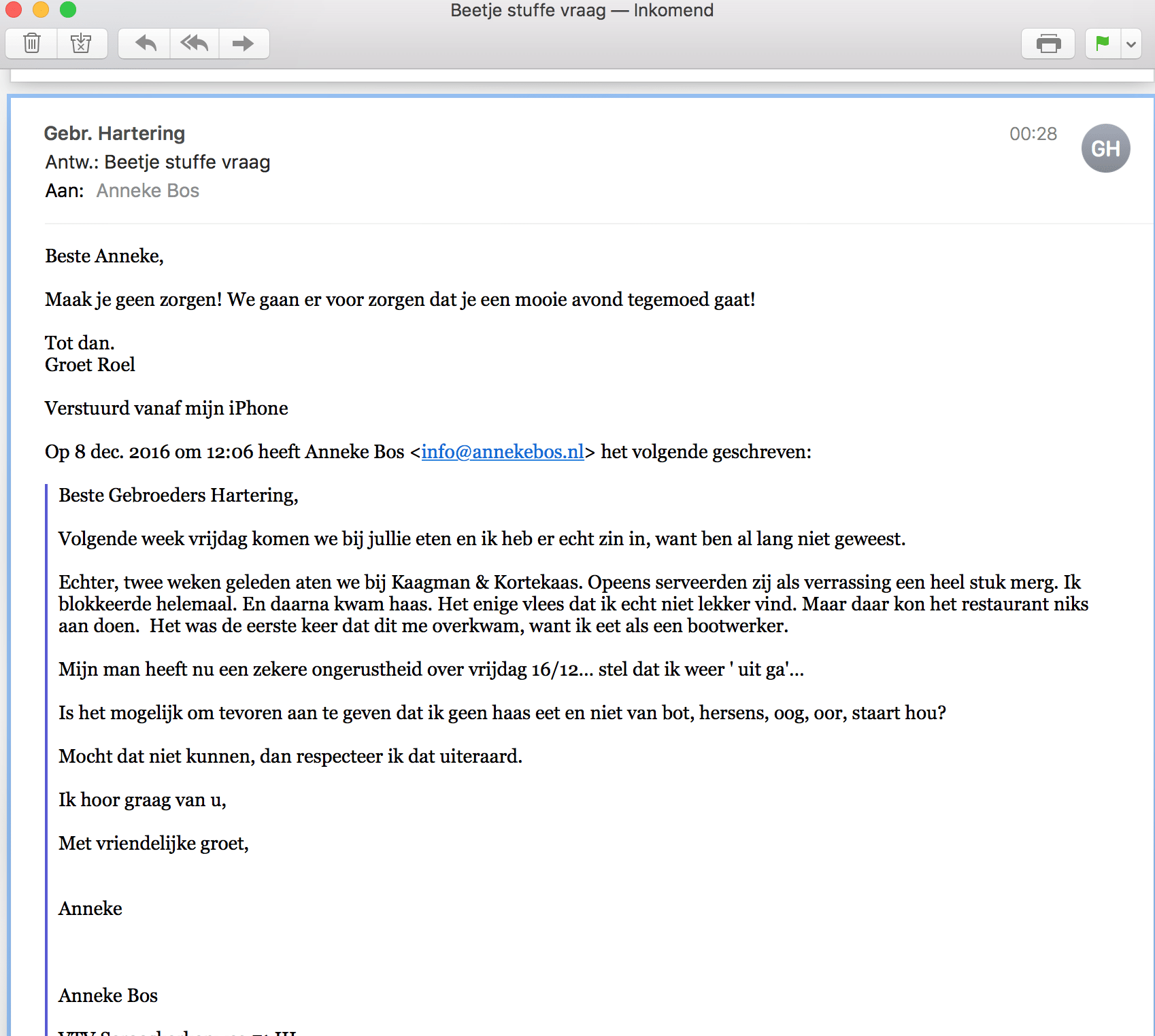 Voor een etentje volgende week heb ik de kok alvast een mailtje geschreven. Zie boven.