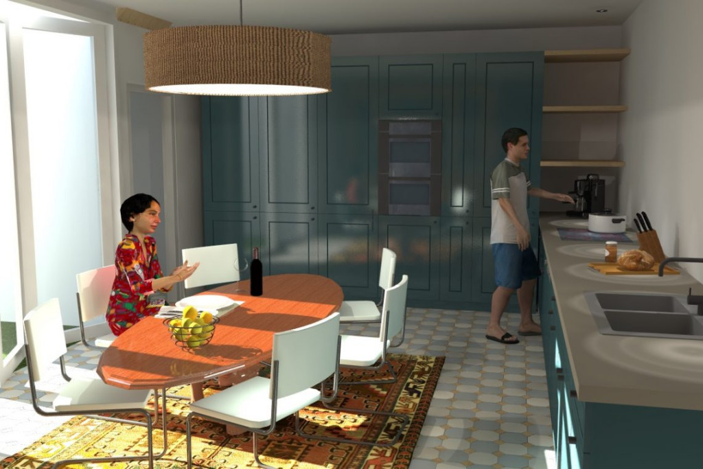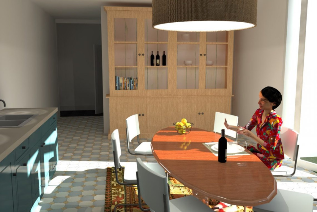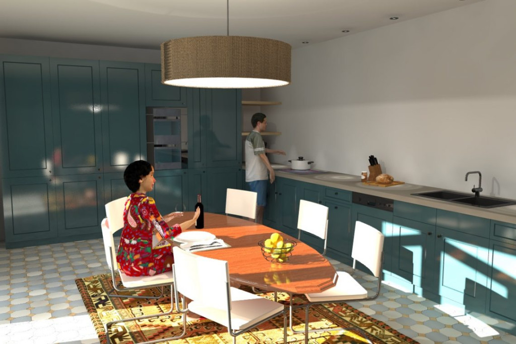 We hebben lang om ons kookeiland heengewandeld. Het was gezellig, het was leuk om eroverheen naar elkaar te kunnen kijken als er gekookt zou worden, het gaf een hoop extra werkruimte, maar het stond ook geweldig dominant in de weg te staan. Stock Interiors heeft er een paar dagen op zitten te broeden, en toen iets nieuws aan ons voorgesteld. Een L-vormige keuken. Met aan de lange wand alleen een aanrecht, en aan de korte wand kamerbreed hoge kasten.
