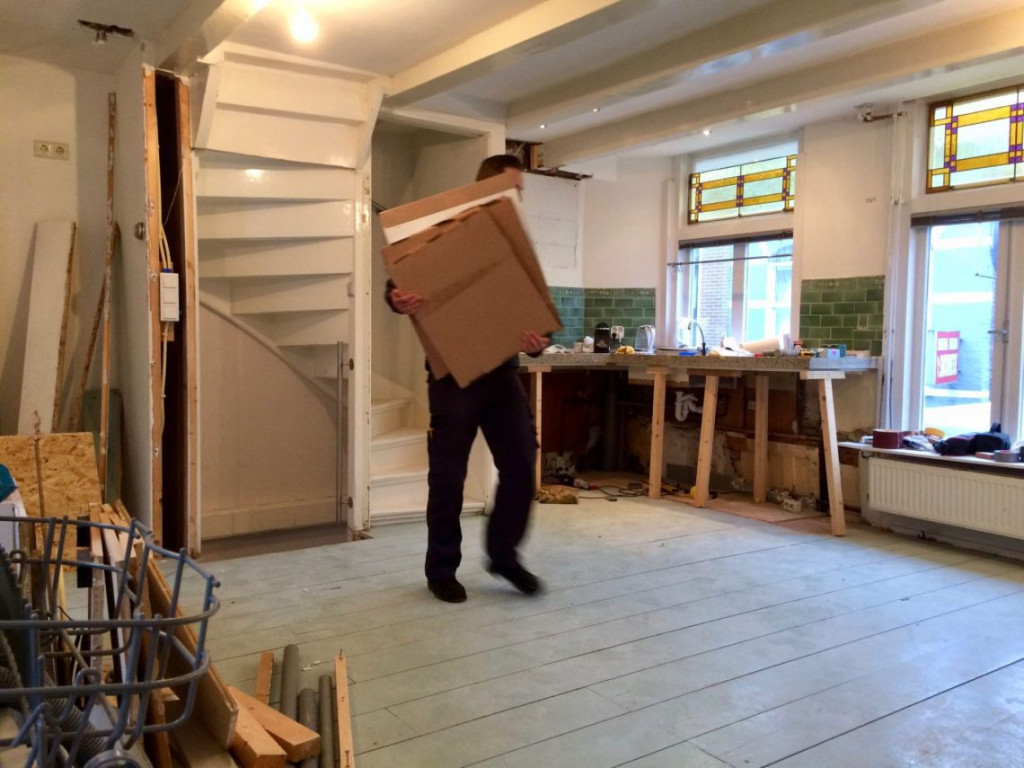 Keurig op tijd kwam de vrachtwagen van Ikea voorrijden. Twee frisse jongens sjouwden alles de trap op