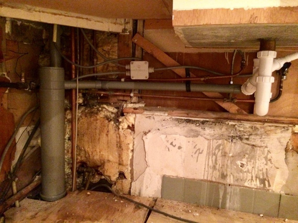 De historie van ons Rijksmonument is erg goed af te lezen aan de situatie onder het aanrecht. Een monumentale troep. Gelukkig zien we daar morgen niks meer van, als de nieuwe kastjes er voor gezet worden.