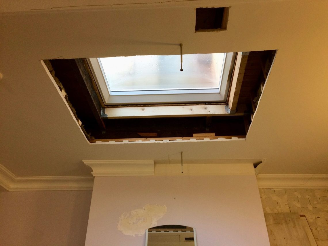 Het resultaat was spectaculair. Het lichtvlak in de woonkamer lijkt haast wel verdubbeld, en bovendien is het nu een serieus gat in het plafond, passend bij het oppervlak van de woonkamer, in plaats van het armoedige kijkgaatje wat het hiervoor nog was.