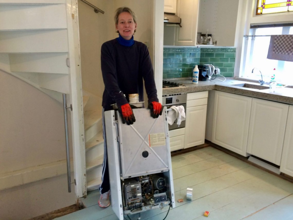 Nadat de keuken gereed was wilden we al het vuil, echt alles weg doen. Boven op het badkamerdakje lagen nog een soort van ’terrastegeltjes’, te smerig voor woorden, met algen en dat soort dingen. Die hebben we allemaal verwijderd. Evenals de oude HR ketel, die eigenlijk te zwaar voor me was (again)