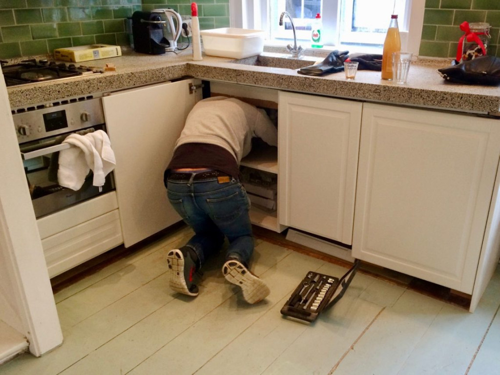 Ondertussen vroeg ik aan Hessel of het niet gek was dat de kraan in de keuken zo los zat. Hessel verslikte zich even en voelde aan de kraan: heel gek: helemaal los. Wat nu nogal irritant is, want alle onderkasten zijn al gemonteerd. Hup Hessel dook het kastje in en kwam er na een tijdje weer uit.