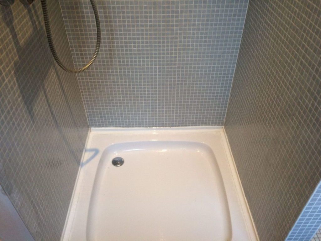 Vervolgens nam ik de badkamer onder handen. Die was ook behoorlijk smerig geworden van het zagen, stucen en wat al niet meer. De muren van de douche heb ik ingespoten met ‘HG tegen schimmel en nog iets’ en gelukkig werkte dat. De douche ziet er nu fris uit.