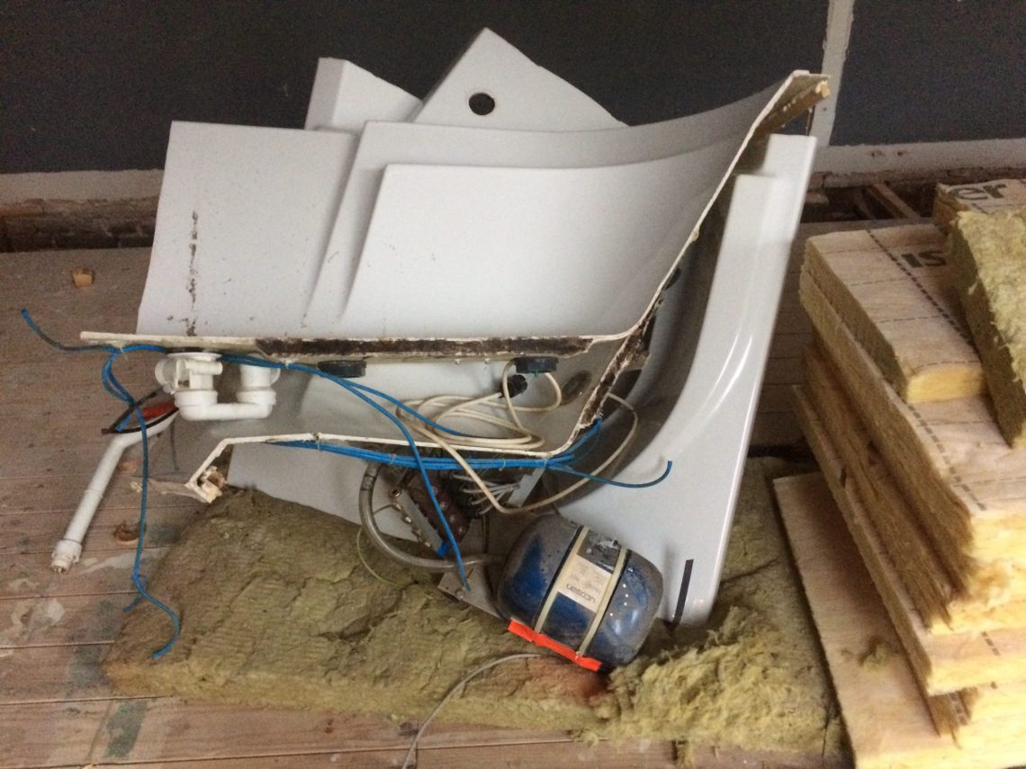 De eerste helft liet zich toen snel weghalen. De tweede helft had nog wat verrassingen in petto. Er zat een flinke machinekamer aan vast gemonteerd. Wij hebben het bad nooit in werking gezien, maar het moet in zijn gloriedagen een enorm bubbelfestival geweest zijn, zo groot was de aandrijfmotor.