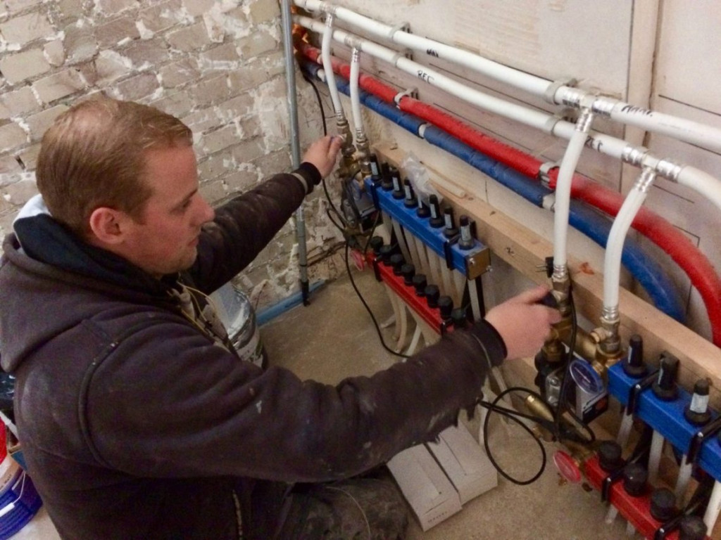 Bart was al om 8 uur in het huis, ik kwam om 10 uur aankakken, precies op tijd om het magische moment mee te maken. Het was feitelijk reuze simpel, er werden twee kranen opengedraaid, er werden twee thermostaten gemonteerd, de stekkers gingen in het stopcontact, en heel zachtjes zoemend kwam de vloerverwarming tot leven, maar het voelde als een groots moment.