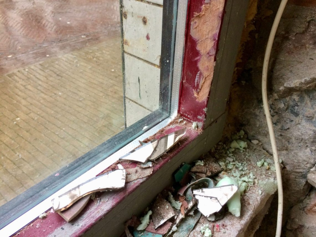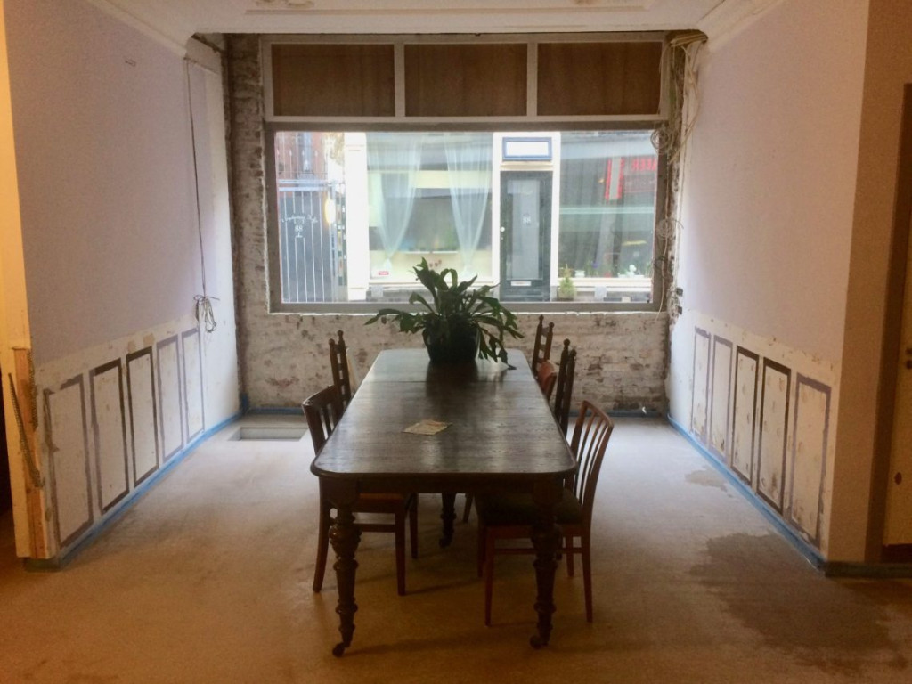 Om Bart niet steeds op zijn vingers te kijken, hij moest ook nog wat laatste klusjes aan de waterleiding afmaken, ben ik wat klein werk in de woonkamer gaan doen. Ons raamkozijn bij de straat was vroeger de etalage van een bioscoop. Indertijd had men spiegels aan de wanden, en ook aan het kozijn gelijmd. Nu ons venster zo fraai begint te worden, met het nieuwe bovenlicht, vond ik dat ook de laatste restjes spiegel verwijderd moesten worden. Met hulp van Annies verfbrander kon ik de lijm wat zachter maken, en daarna heb ik met m’n Festool Vecturo OS 400 EQ oscillerende multitool alle stukjes glas kunnen loszagen. Het lijkt misschien of ik gesponsord wordt door Festool, zo vaak heb ik het erover. Was het maar waar. Ik ben als ik aan het werk ben zo ontzettend blij dat ik aan het begin van de klus besloten heb om alleen maar met hele goede apparatuur te werken, dat ik er daarom af en toe over schrijf. Zonder die malle machine had ik echt helemaal nooit het spiegelglas van de kozijnen af gekregen. Met het schone kozijn, zijn de allerlaatste herinneringen aan het bioscoop/tatoo-venster definitief verdwenen. Het gaat steeds meer op een woonhuis lijken.