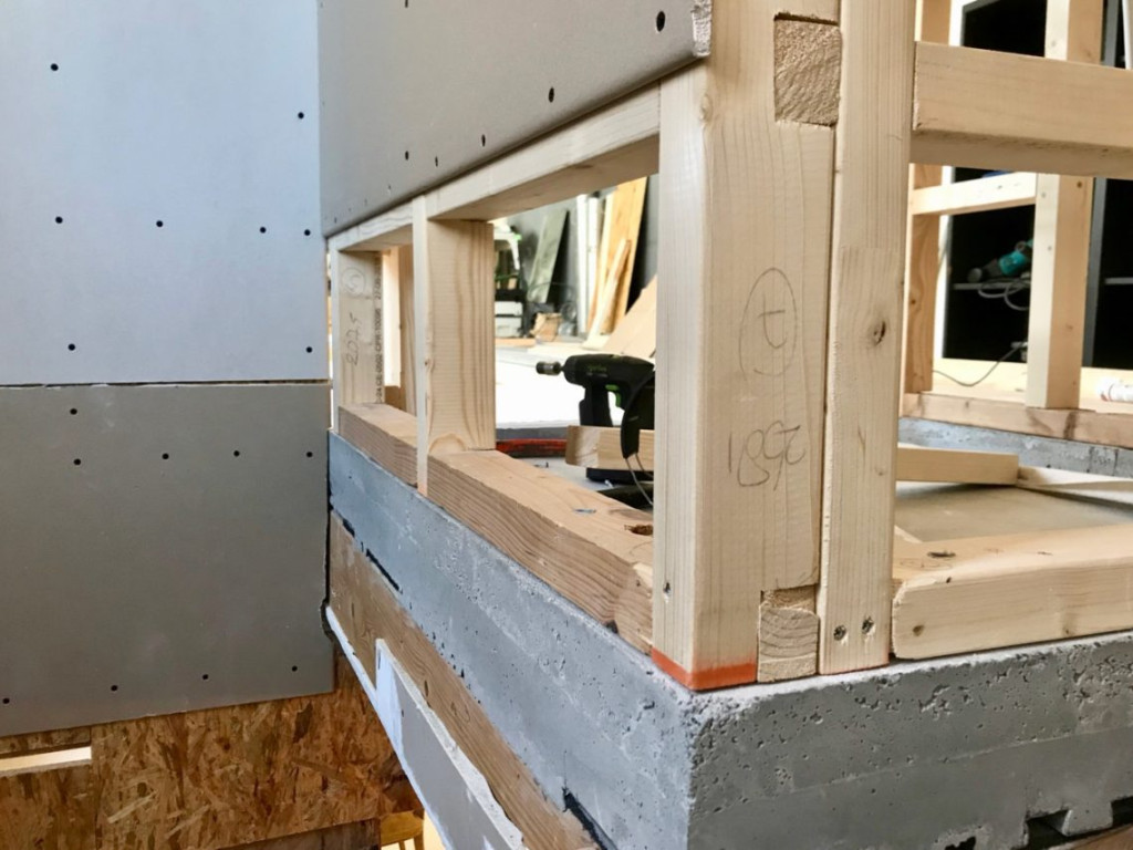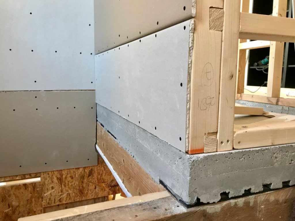 Niet veel later is ook het onderste gipsplaatje gemonteerd. Tot op de rand van de douchebak, volgens plan. Aan de achterzijde, in de verste hoek, zie je dat het gipsplaatje iets over de betonnen bak heensteekt. Dat is omdat de houten balk eronder een beetje scheef naar buiten loopt.