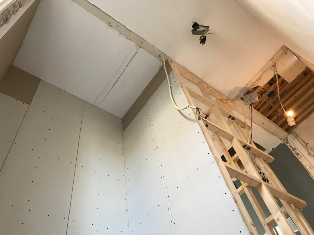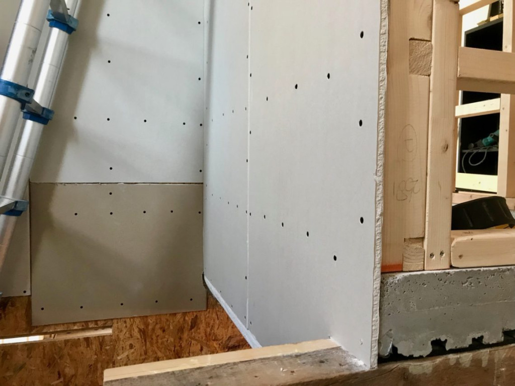 Een uurtje balanceren later was de tweede laag gipsplaten er overheen gemonteerd. Ditmaal verticaal. Keurig over de betonnen bak heen, aansluitend bij de ronding in het plafond, aansluitend op het schuine stukje balk.