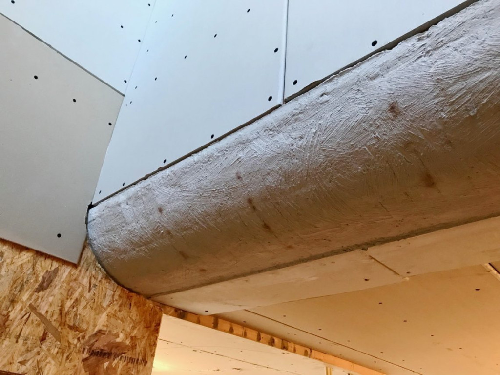 De ronding boven de trap: Het plafond van de keuken krijgt dubbel gips. Dan komt er een ronding in dat gips, die naadloos overloopt in de douchemuur erboven.
