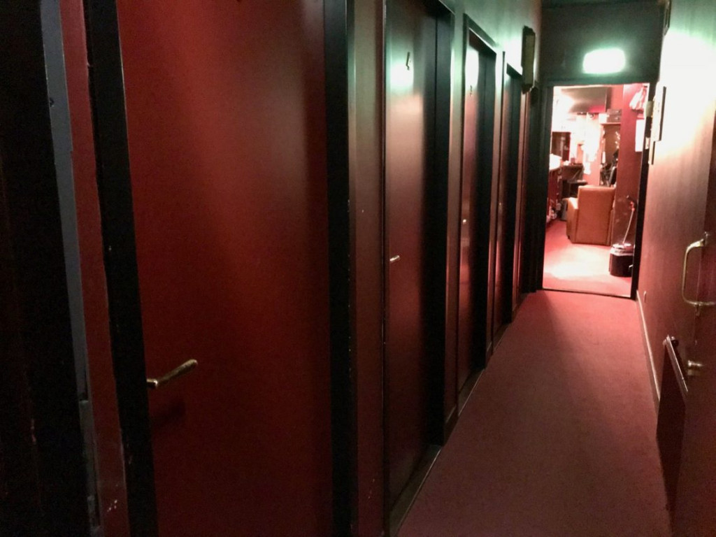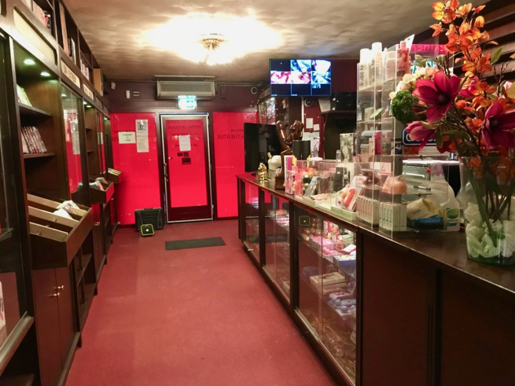 Op de foto hierboven zien we de winkel. Hier kom je vanuit onze straat het pand binnen. Aan de toonbank links koop je je dagkaart, waarmee je links achterin een gang mag betreden, met een rijtje cabines.