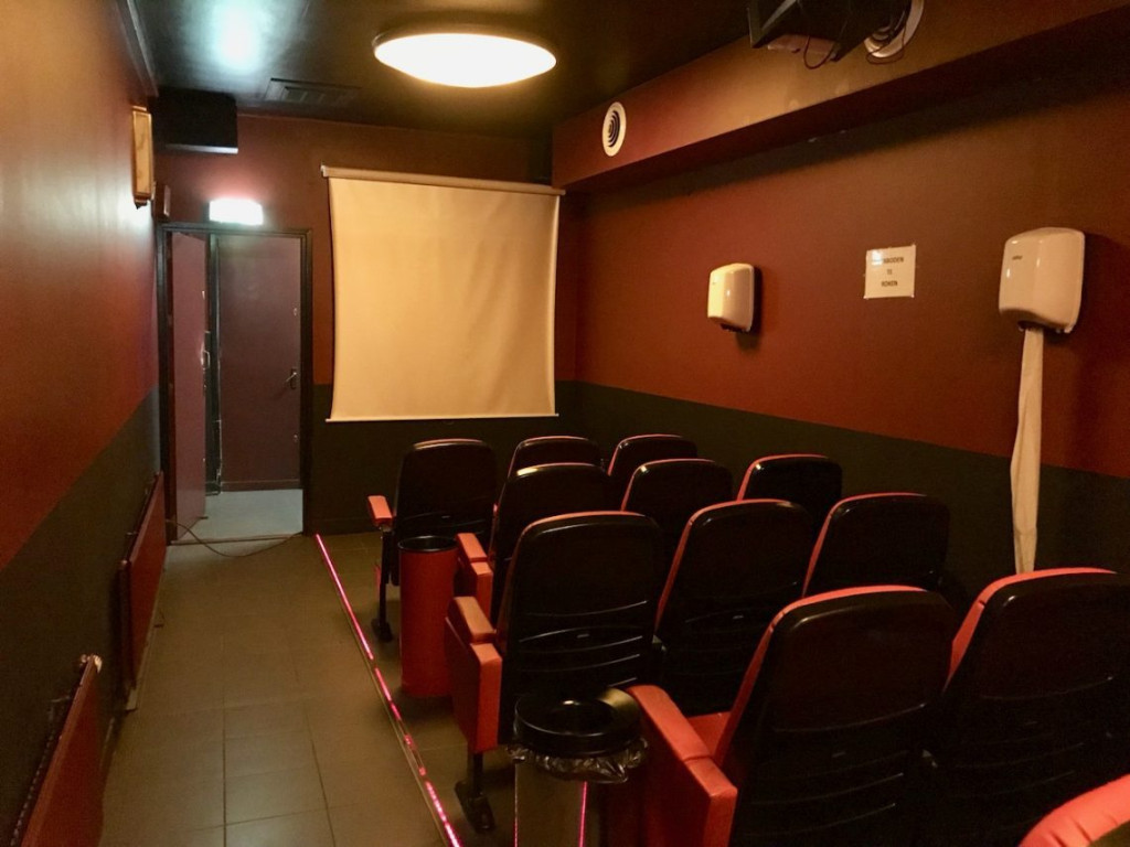 Lopen we verder door, dan komen we in de bioscoopzaal. Het beeld spreekt denk ik voor zichzelf. Hier zijn we ter hoogte van onze gang, vlak naast het scherm is onze WC.