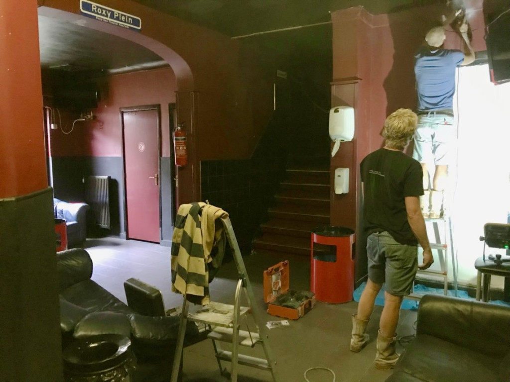 Gelukkig, daar was de leiding dan toch. Hij bleek naar de hoek te lopen. In dezelfde hoek van het theater hing een TV monitor, en ja hoor, achter die monitor vertrok onze leiding. Afgekoppeld, opgeruimd, nog een kopje koffie en wat sterke verhalen later en de mannen waren weer vertrokken.