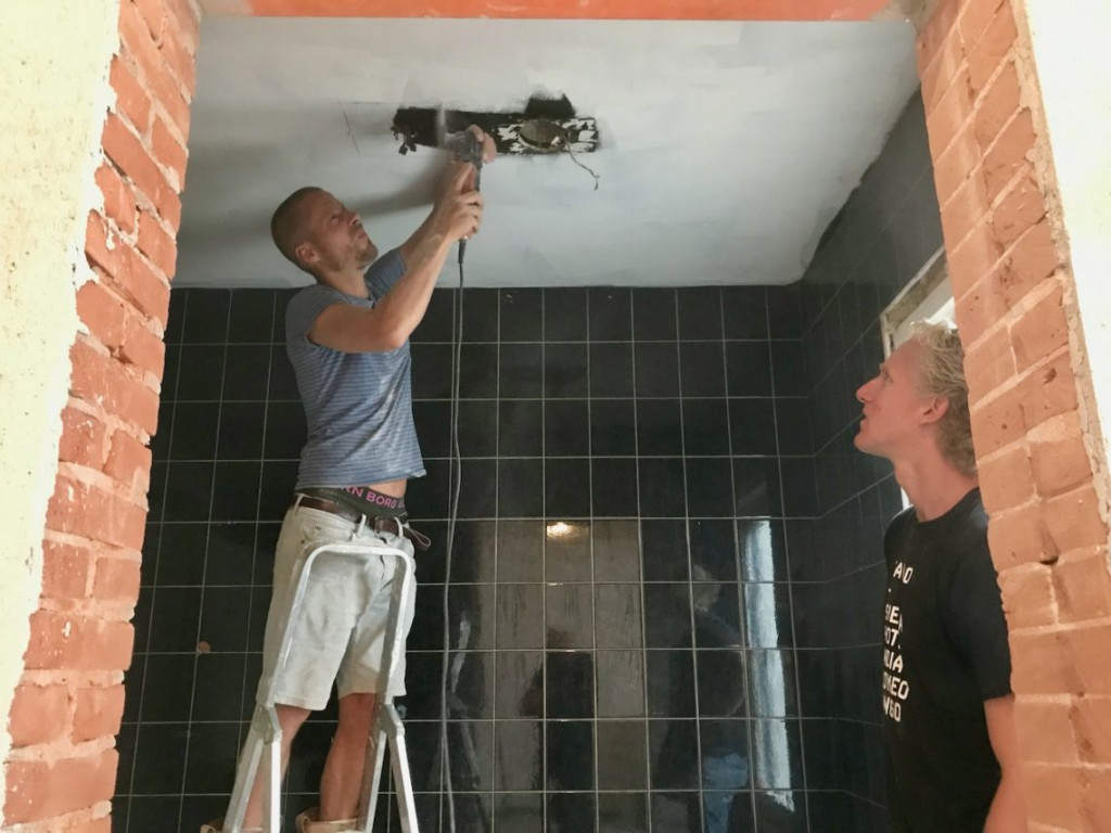 Twee elektriciens die recht boven de witgestuukte voormalige deur naar onze wasmachinekamer een gat in het plafond aan het zagen zijn. Zij hopen daar de electraleiding te vinden die afgesloten moet worden.