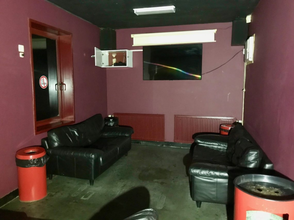 Kijken we de andere kant op, naar links, dan zien we de herenrecreatiezaal. In de linkerwand zit het raam wat deze zomer soms openstond, en waardoor wij, vanuit onze slaapkamer, sigarettenrokende mannen konden zien. Er zit nu een rolluik voor, wat op ons verzoek vergrendeld is. Geen peuken meer op ons dak.