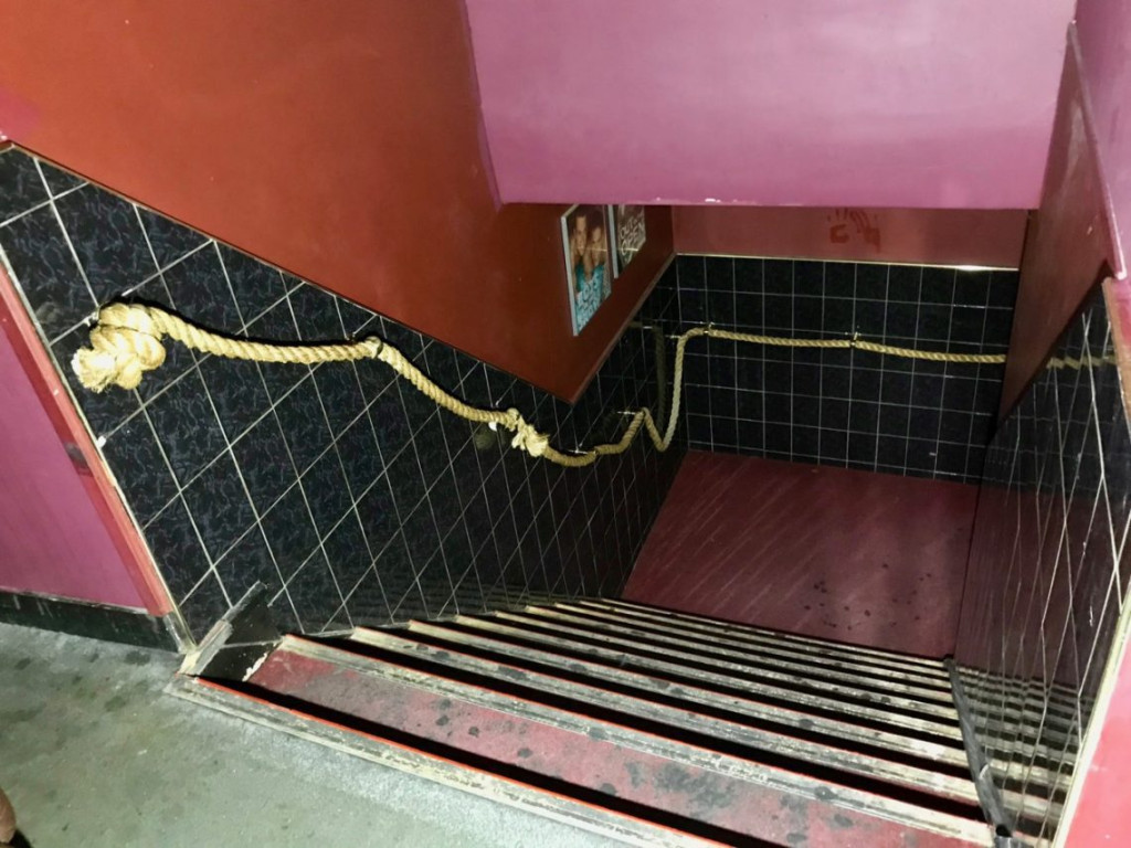 Terwijl zij doorzagen, lopen wij verder. Links achter op het plein is daglicht te zien. Daar zit de nooddeur naar de steeg achter ons huis, die ik stiekem open had gezet om wat extra licht voor de foto’s binnen te krijgen.