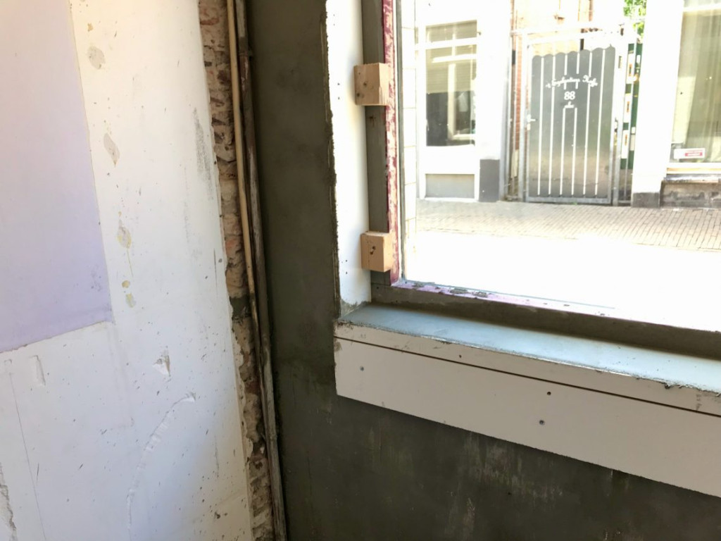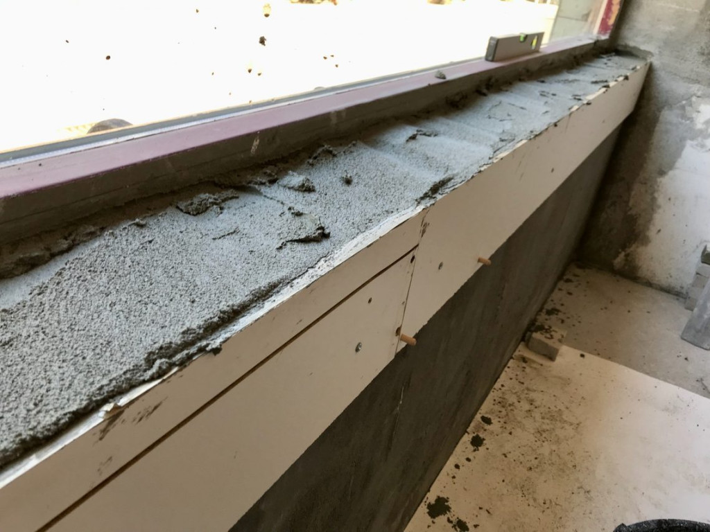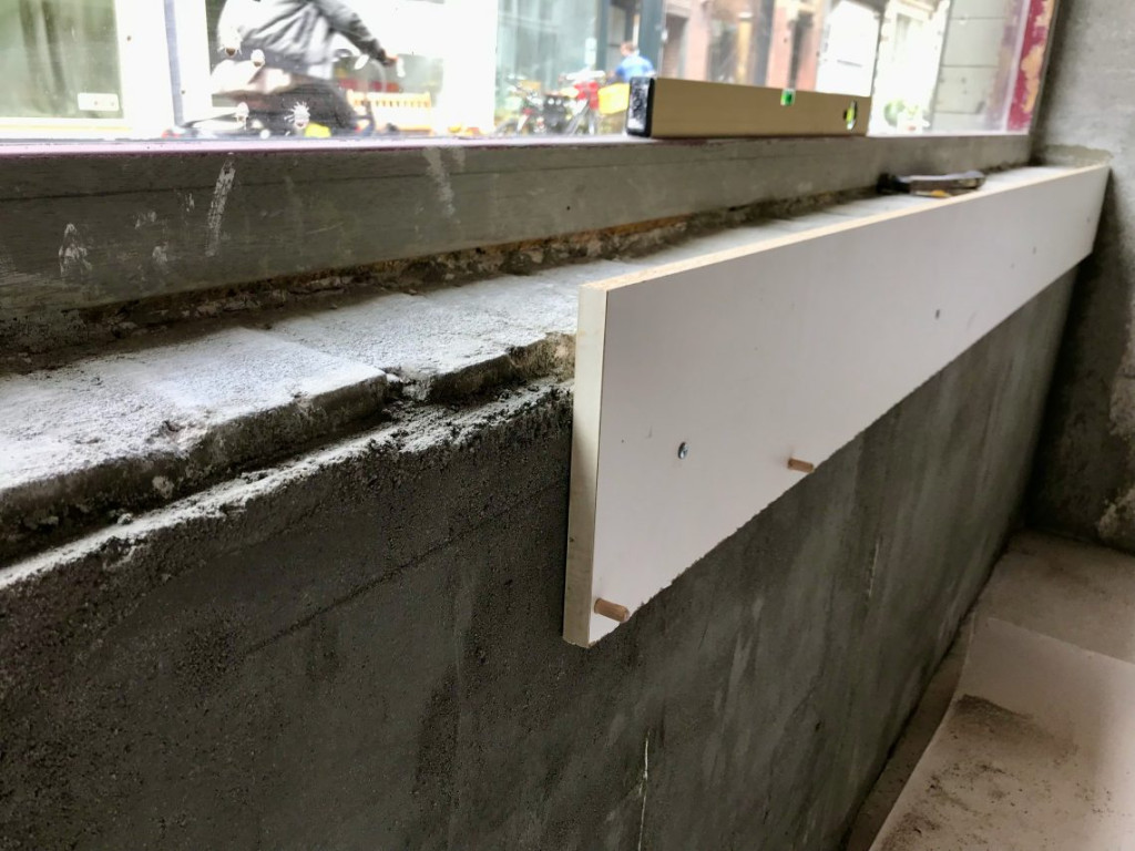 Ik had gemerkt dat het muurtje helemaal niet horizontaal was, maar, erger nog, ook het raam bleek scheef in de gevel te zitten. Ik heb de plank zodanig bevestigd, dat de bovenkant op het oog gelijk lijkt te lopen met het raam, maar stiekem heb ik hem een beetje gecorrigeerd, zodat de nieuwe vensterbank toch min of meer horizontaal gaat worden.
