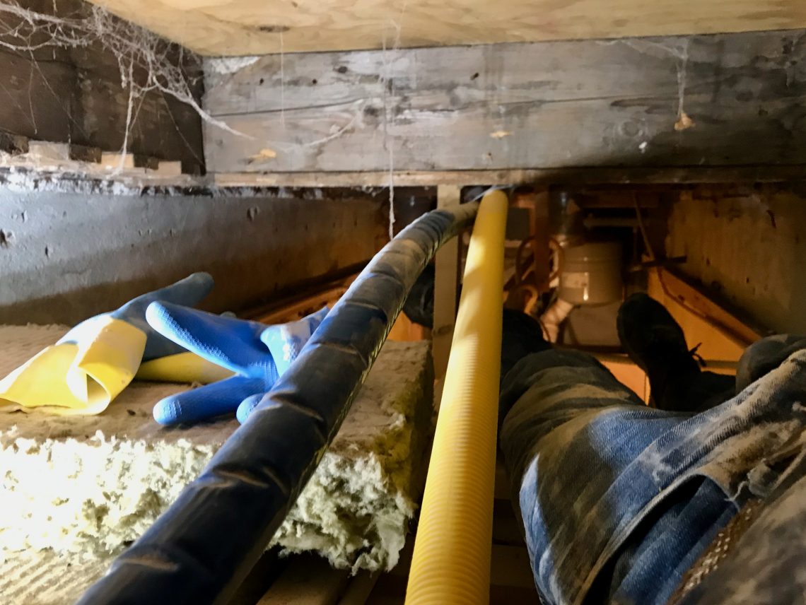 Ik heb zelfs op plekken gewerkt waar ik nog nooit eerder geweest was. Zo heb ik bijvoorbeeld ontdekt dat je, als je plat op je rug ligt, of plat op je buik, of als je echt wilt driekwart op je zij, dat je dan op het laatste stukje van het plafond van onze gang kunt kruipen. Reuze handig, want daar moest een serieuze hoeveelheid rockwool aangebracht worden. Het hele rangeerterrein van elektraleidingen gaat definitief uit het zicht verdwijnen. Voordat het plafond dicht kon, moest het daar natuurlijk eerst goed geïsoleerd worden.