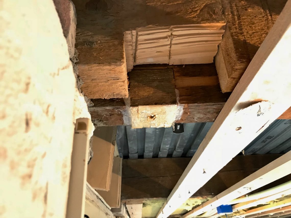 Er moesten hout reparaties gedaan worden. De vorige eigenaren wilden graag een wastafel aan de linkermuur van de badkamer, en wisten niet wat ze met de afvoer moesten. Ze hebben uiteindelijk besloten om maar gewoon een flink stuk uit de vloerbalken te zagen, en daar de pijp doorheen te laten lopen. Het zijn twee gekoppelde balken, die tot overmaat van achtelijkheid ook nog met z’n tweeën op het raamkozijn rusten.
