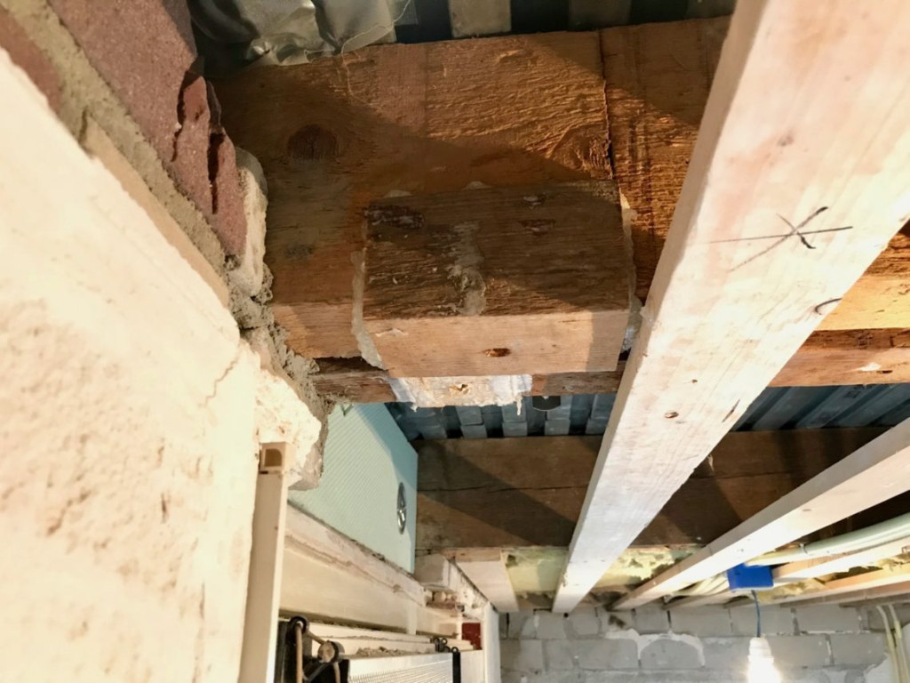 Er moesten hout reparaties gedaan worden. De vorige eigenaren wilden graag een wastafel aan de linkermuur van de badkamer, en wisten niet wat ze met de afvoer moesten. Ze hebben uiteindelijk besloten om maar gewoon een flink stuk uit de vloerbalken te zagen, en daar de pijp doorheen te laten lopen. Het zijn twee gekoppelde balken, die tot overmaat van achtelijkheid ook nog met z’n tweeën op het raamkozijn rusten.