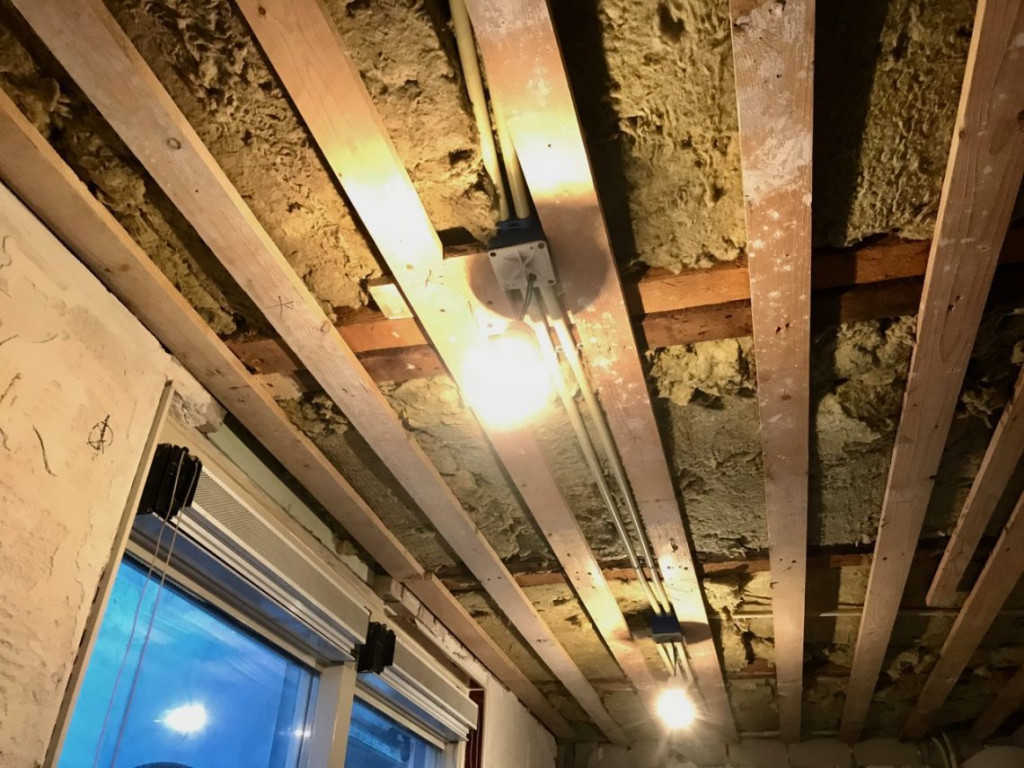 De badkamervloer ligt rustig te drogen. Daar mogen we pas na het weekeind op lopen, dus heb ik mij vandaag maar weer eens op de onderkant van die vloer gericht; het bijkeukenplafond.