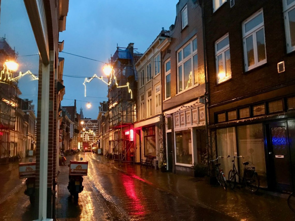 Trouwens, over de straat en over Kerst gesproken; het was vandaag een dolle boel in de straat. Toen ik vanochtend aan kwam, stonden er allemaal vrachtwagens op de stoep. De buren van het theater gaan de voegen vernieuwen. Heel chic, maar ook een beetje onhandig dat hun eerste etage over onze woonetage heen hangt. De steigerbouwers hadden voor het gemak maar een flink stuk van onze voordeur dichtgebouwd. Gelukkig was ik heel vroeg, en konden ze na wat overleg de steiger nog zodanig aanpassen, dat wij gewoon weer door de voordeur naar binnen kunnen. Ergens de afgelopen dagen is ook de gemeente in de weer geweest. We zijn onderdeel van de grote Kerstverlichtingsactiviteiten in Haarlem.