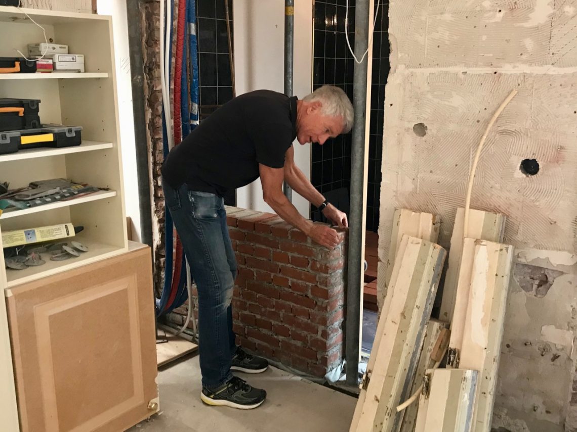 Ondertussen had onze onbezoldigd en onzichtbaar adviseur die werkt onder codenaam Jan V. gemaild, dat het nog beter is om in de bestaande muur inkepinkjes te maken, en daarin te metselen; als een soort ritssluiting. Dan zit het steviger. Die inkepingen had Hessel graag even willen losbikken uit de muur, ware het niet dat wij proberen na 11.00 niet langdurig in de muur van de buren te boren. Anders stoort het wellicht de “werkzaamheden” bij de buurtjes. Wij zouden dat zelf ook niet leuk vinden als we helemaal de moed hadden verzameld en geld betaald om onszelf daar een half uur helemaal te laten gaan, dat er dan drie kwartier een boormachine doorheen kwam. Dus vandaar konden we niet ala minute op het advies inspelen. Morgen tot 11.00 uur is er weer een dag.