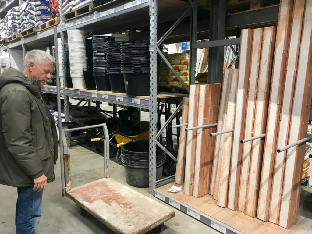 Eerst leek het alsof Hessel een ochtendgebed deed, maar dat was omdat hij met zijn ogen dicht moest uitrekenen welke maat hij nodig had. Er moet 15 cm ‘opleg’ zijn aan beide kanten. Ik zou dat zelf ‘overhang’ noemen. Dus. De deur is 93 cm, plus 30 is 123 cm in totaal. Neem je dan een latei van 120 cm of van 140 cm? Tussenmaten zijn er niet. Grootmoedig bood ik aan voor 14,- extra ook de 140 cm mee te nemen, maar dat grandioze aanbod sloeg Hessel af.