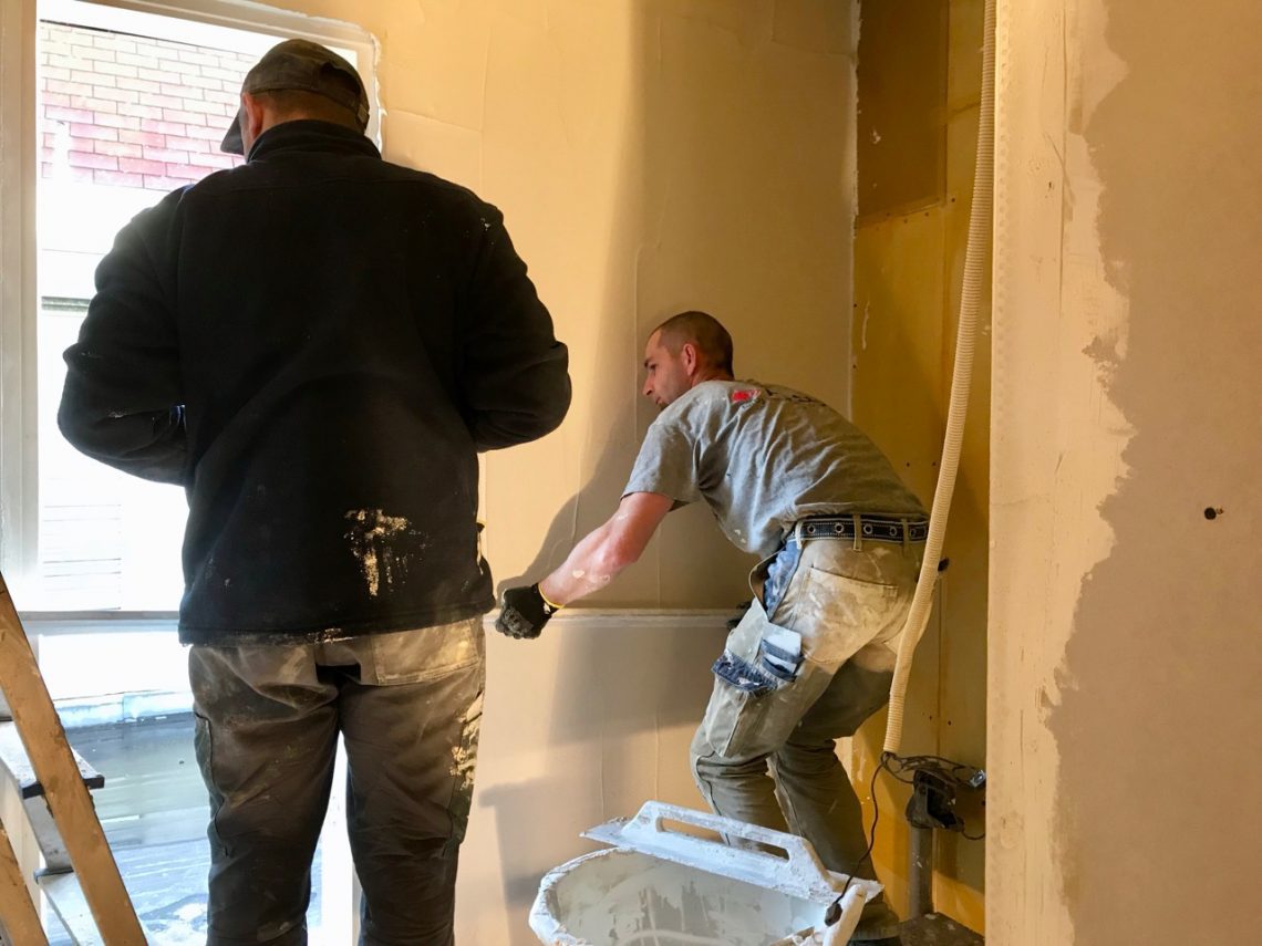 De rest was een peuleschil. Het wandje van de logeerkamer. Nog maar een week oud, helemaal recht gebouwd en zonder vreemde verrassingen. Marcin poseert hier tussen inmiddels drie gestuukte wanden.