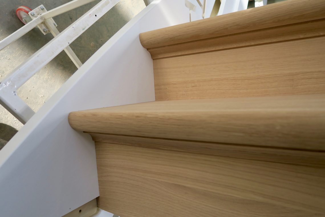 De foto boven aan dit blog was een kleine demonstratie opstelling. Zo ongeveer gaat de trap er straks uitzien. Ik was heel erg te spreken over het eindresultaat van onze zelfgekozen beitel. De voorkant van de trede en het richeltje eronder geven de trap beslist een zekere je ne sais quoi.