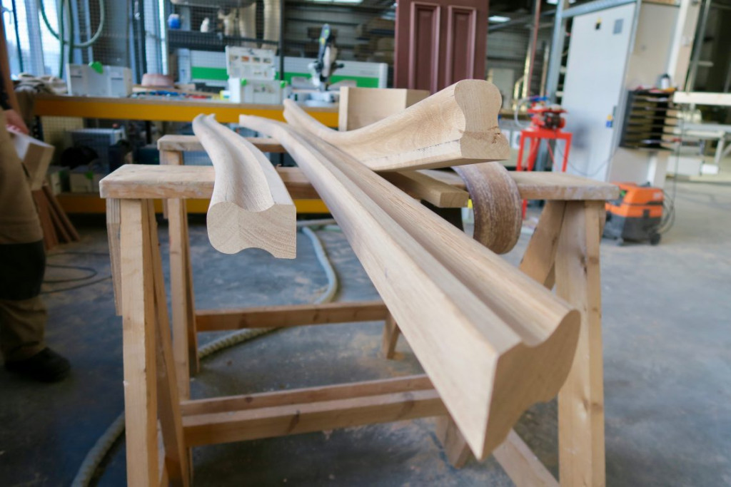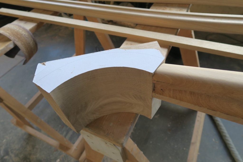 Hij was eerst nog even met de wrongstukken bezig. Dat zijn de “hoeken” in de leuning. Die geeft hij een ruwe vorm, daarna gaan ze samen met de krullen voor de uiteinden van de leuning naar de kunstenaar/houtsnijder in het dorp.