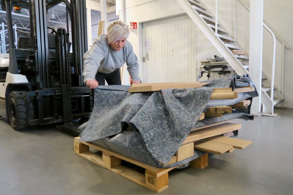 In Alphen aan de Rijn, bij de firma Uipkes, stond hoofdzuster Stacey al op me te wachten. Ze had een pallet voorbereid, en eindeloze hoeveelheden beschermdoek. Samen hebben we de trap op de pallet geladen.