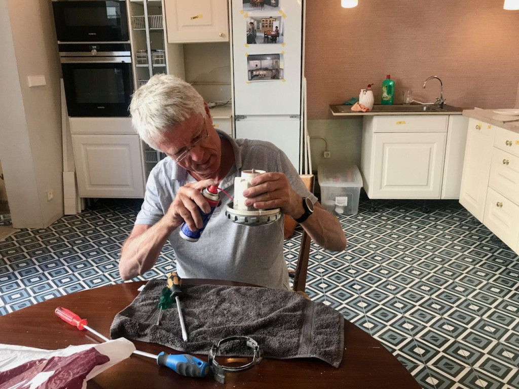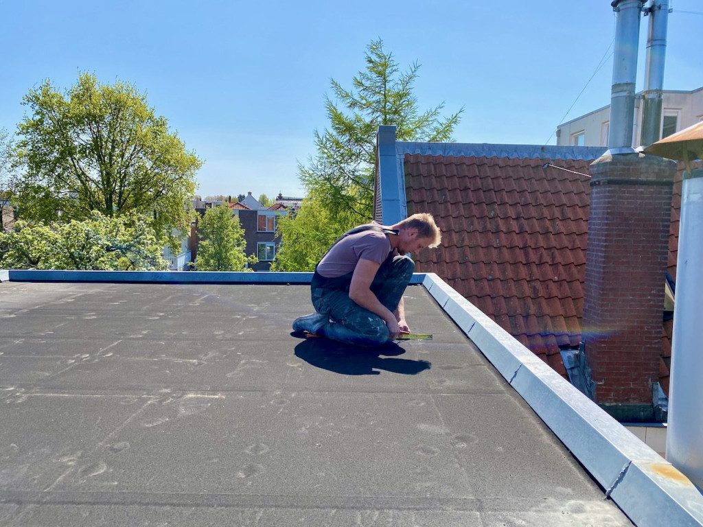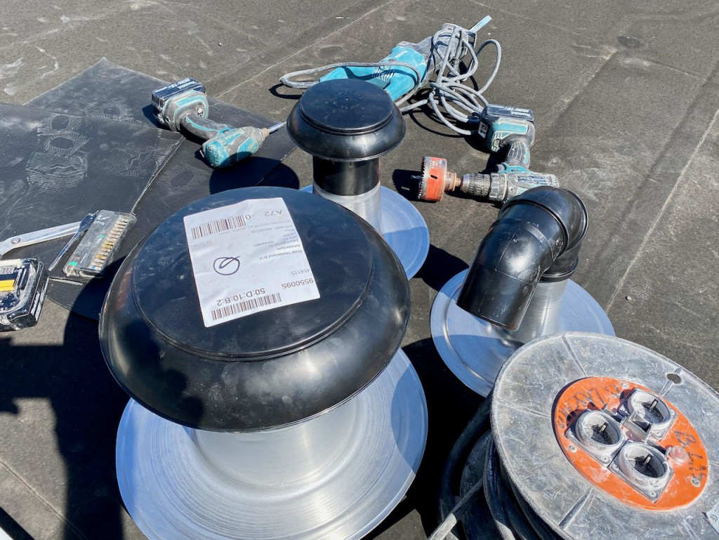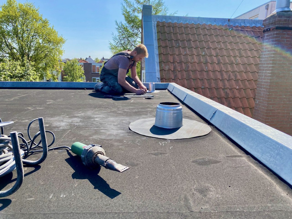 Toen kwam onze Bart, want die ging dakdoorvoer maken voor de ontluchting van het riool en de afzuigkap. Hij ging ook een waterkraan maken op het dak. Dan kan de Blauwe regen en de eventuele daktuin van later makkelijk water krijgen.