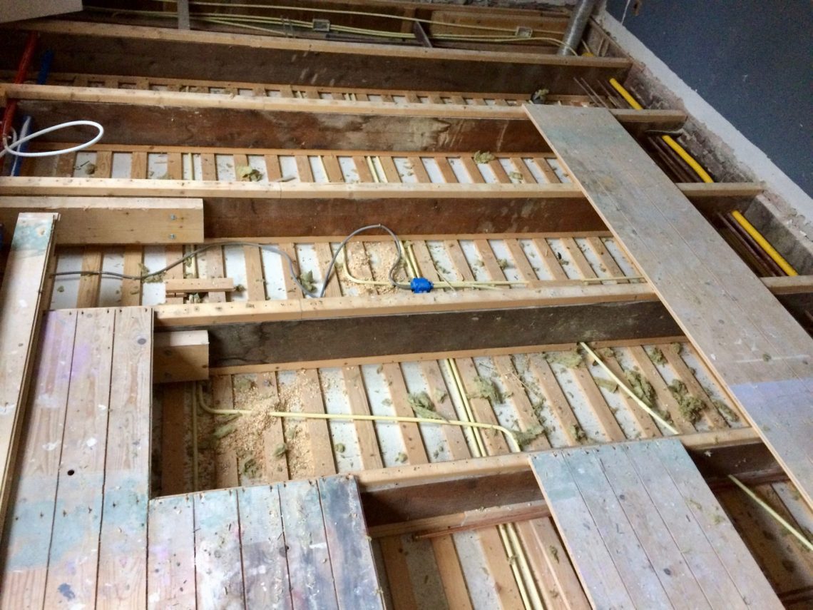 Tussen de bedrijven door heb ik de helft van de vloerplanken van de slaapetage gedemonteerd, en al het isolatiemateriaal en andere troep tussen de balken vandaan gehaald. Vanochtend was ik bij de bouwmaat om daar nieuwe balkjes te kopen. Die ga ik binnenkort op de oude balken verlijmen, opdat de slaapkamervloer weer helemaal horizontaal wordt.