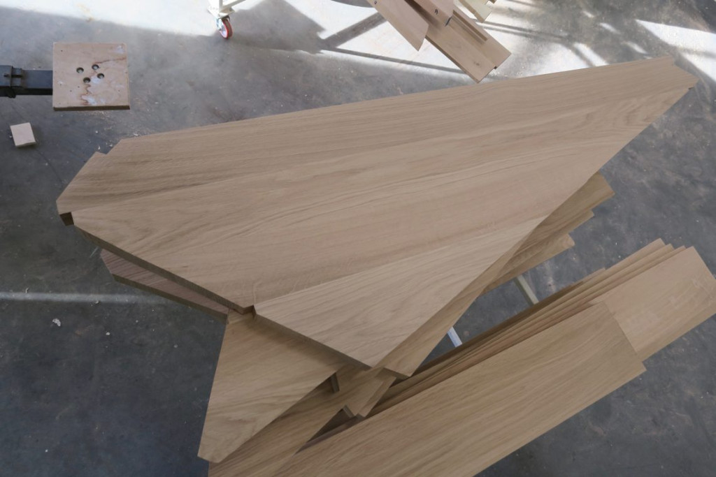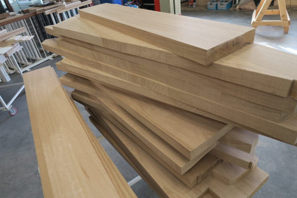 Uit verschillende planken eikenhout heeft hij onze treden opgebouwd. Per trede zijn een paar plankjes tegen elkaar aangelijmd.
