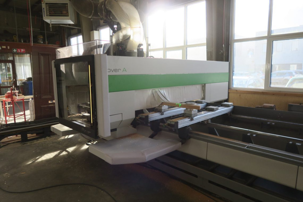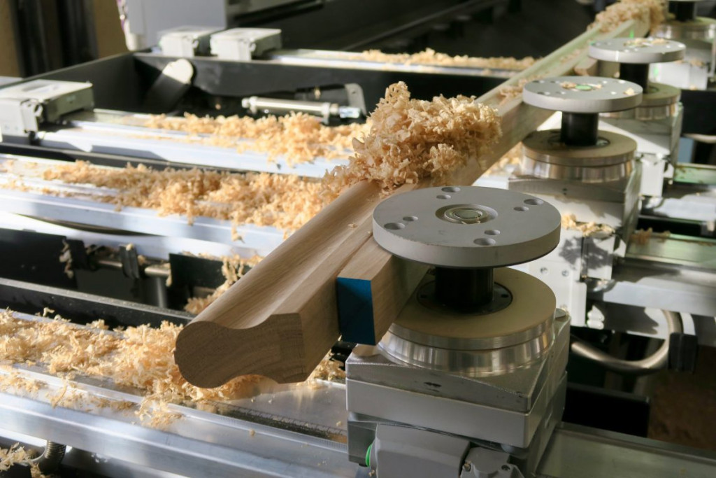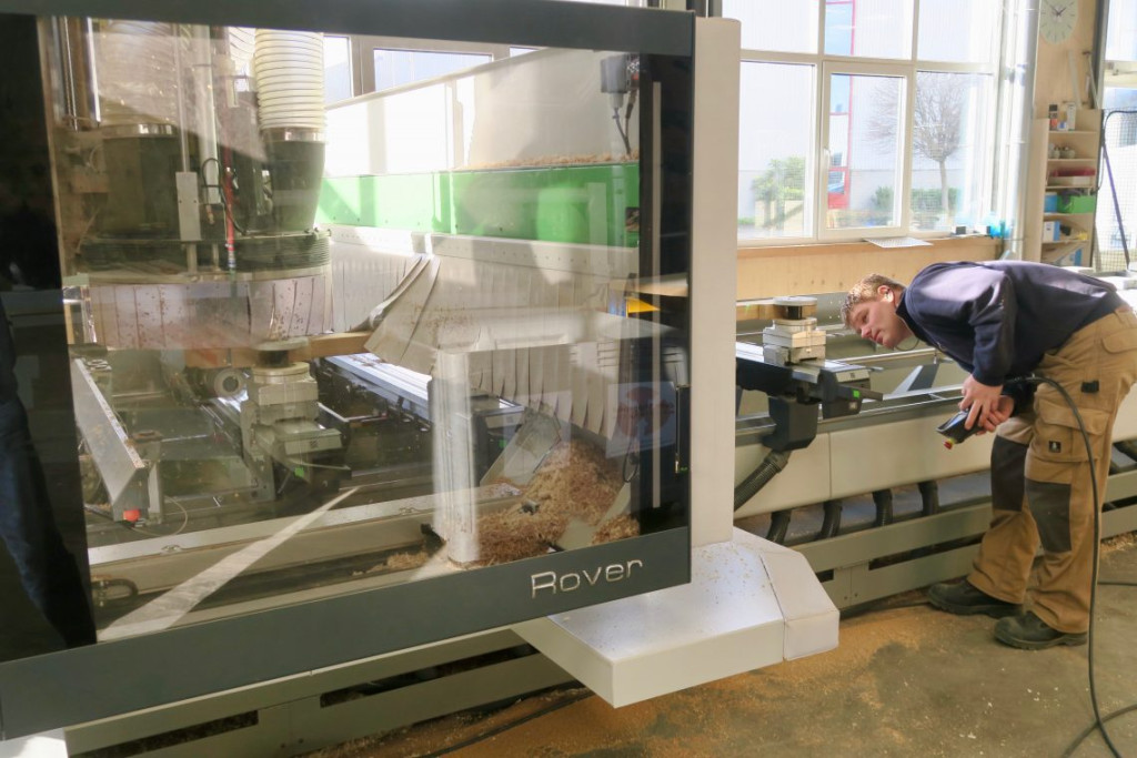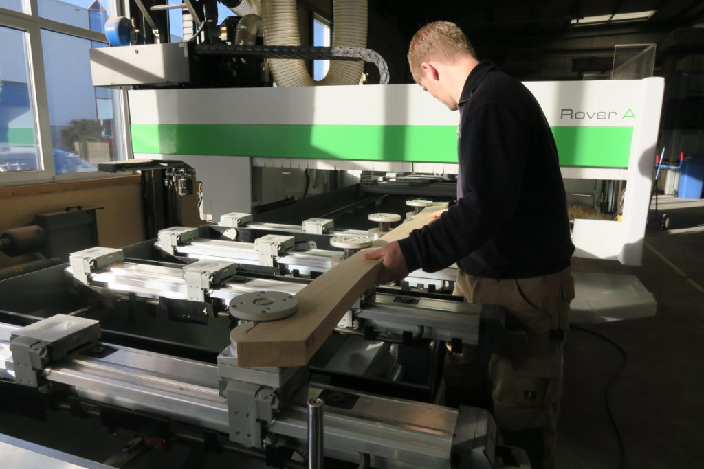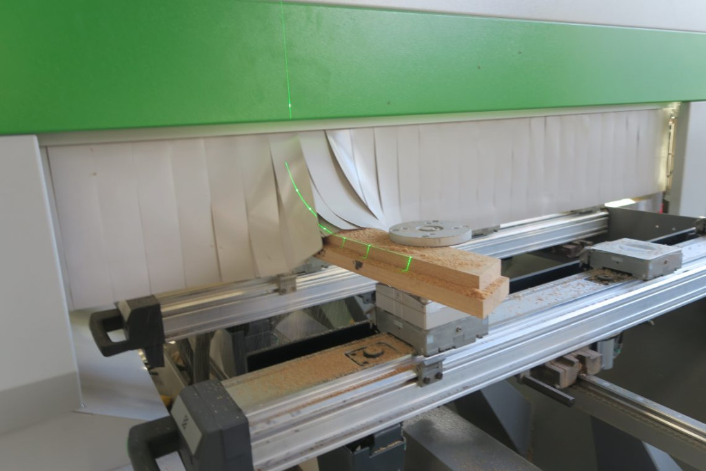 Hij pakte een stuk hout van de “leuningen stapel” en bevestigde het op een heel groot klemmenplateau. De computer projecteerde ondertussen met een laserstraal de uiteindelijke afmetingen van de leuning op het stuk hout.