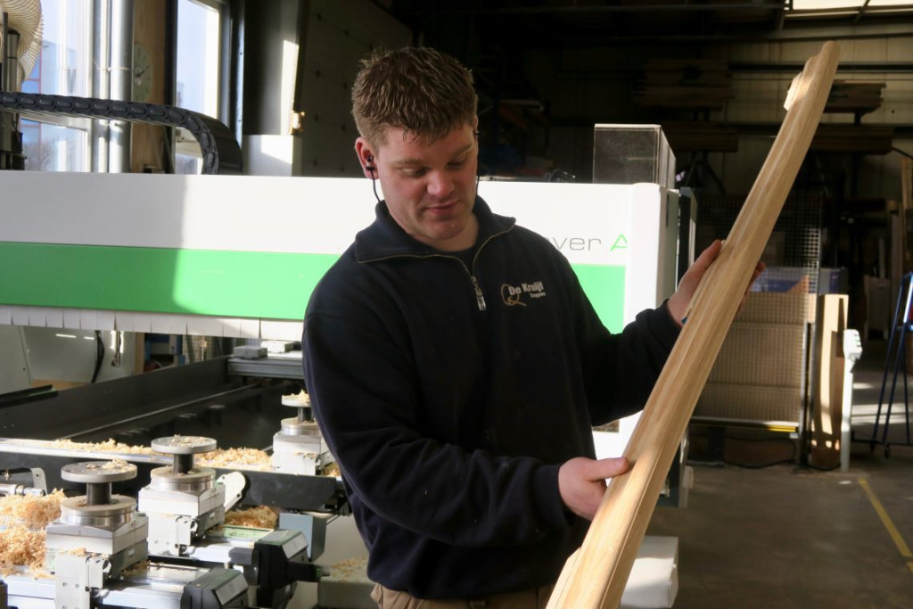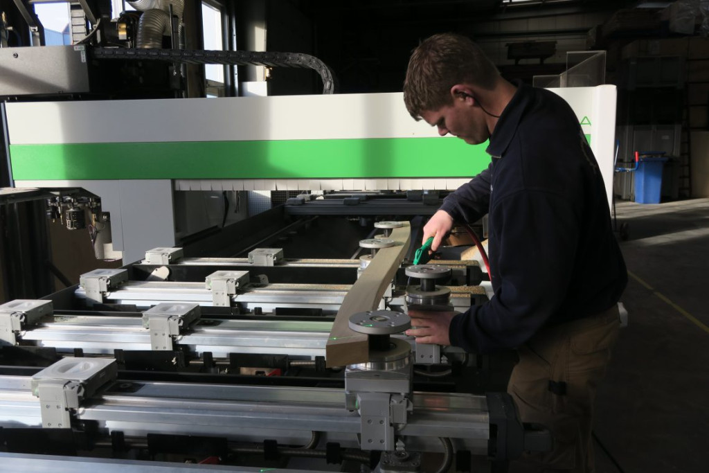 Zoals het nu met de leuning ging, zo gaat het de komende dagen met alle andere onderdelen. Vastklemmen, met de laserlijn controleren of de planken op de juiste plek liggen, en de machine starten.