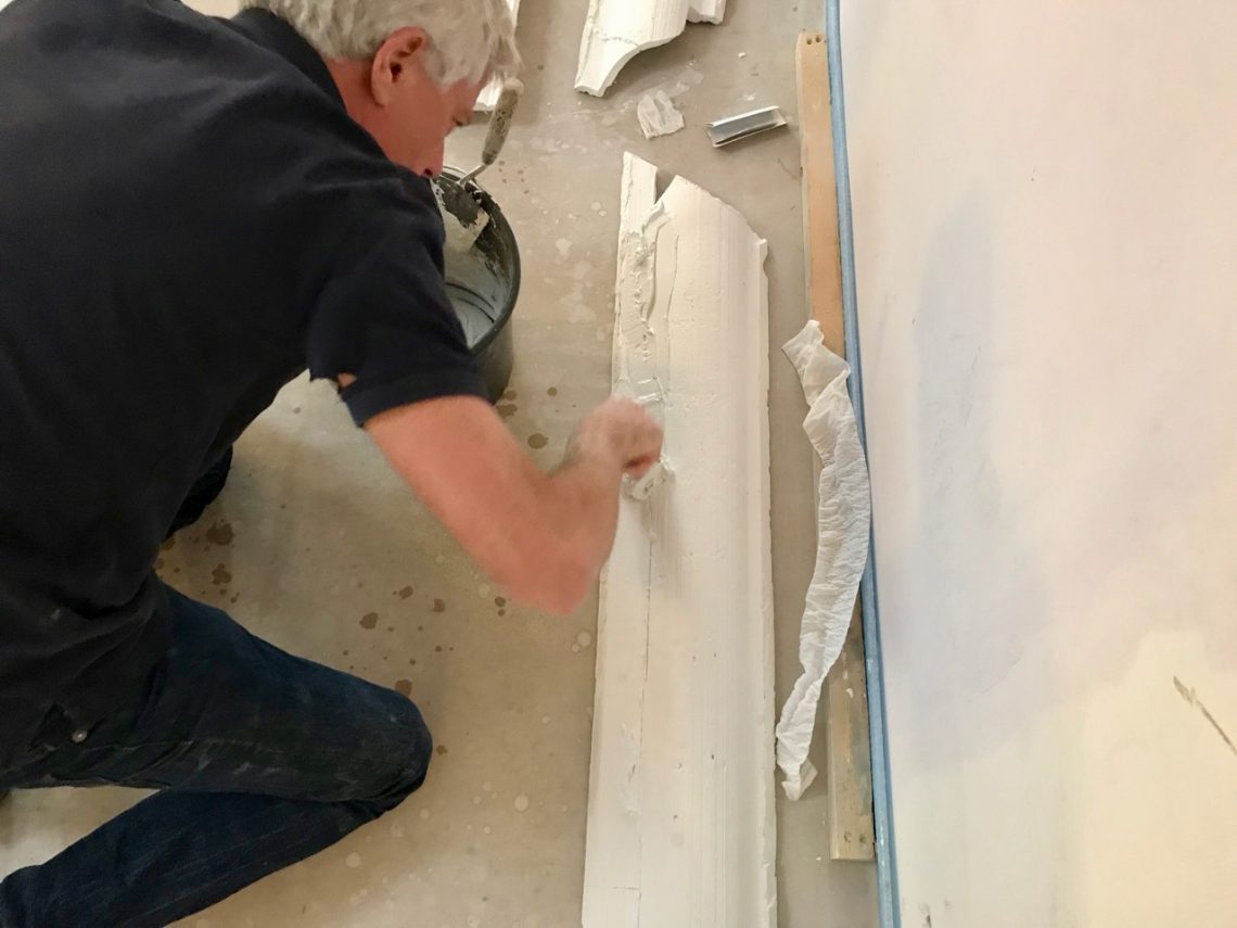 Snel maakte hij nieuw gips om de achterkanten vast te maken. Eerst alles natmaken, gaasverband op maat knippen en natmaken en dan snel op de naden leggen en insmeren. Kl**&^%5-krachterm. Hoezo had het meisje van de DA drogisterij elastisch gaasverband mee gegeven? Dat werkt toch niet op plafondlijsten! Oeps. Hessel in paniek, want de emmer lijm stond al klaar en was aan het drogen. Ik stond in de aanslag naar de Etos te rennen, maar we bedachten ons dat de Polen wellicht nog gipsgaas hadden achtergelaten. Hoera! gered. Snel alle naden vastmaken en alle patientjes rustig laten liggen.